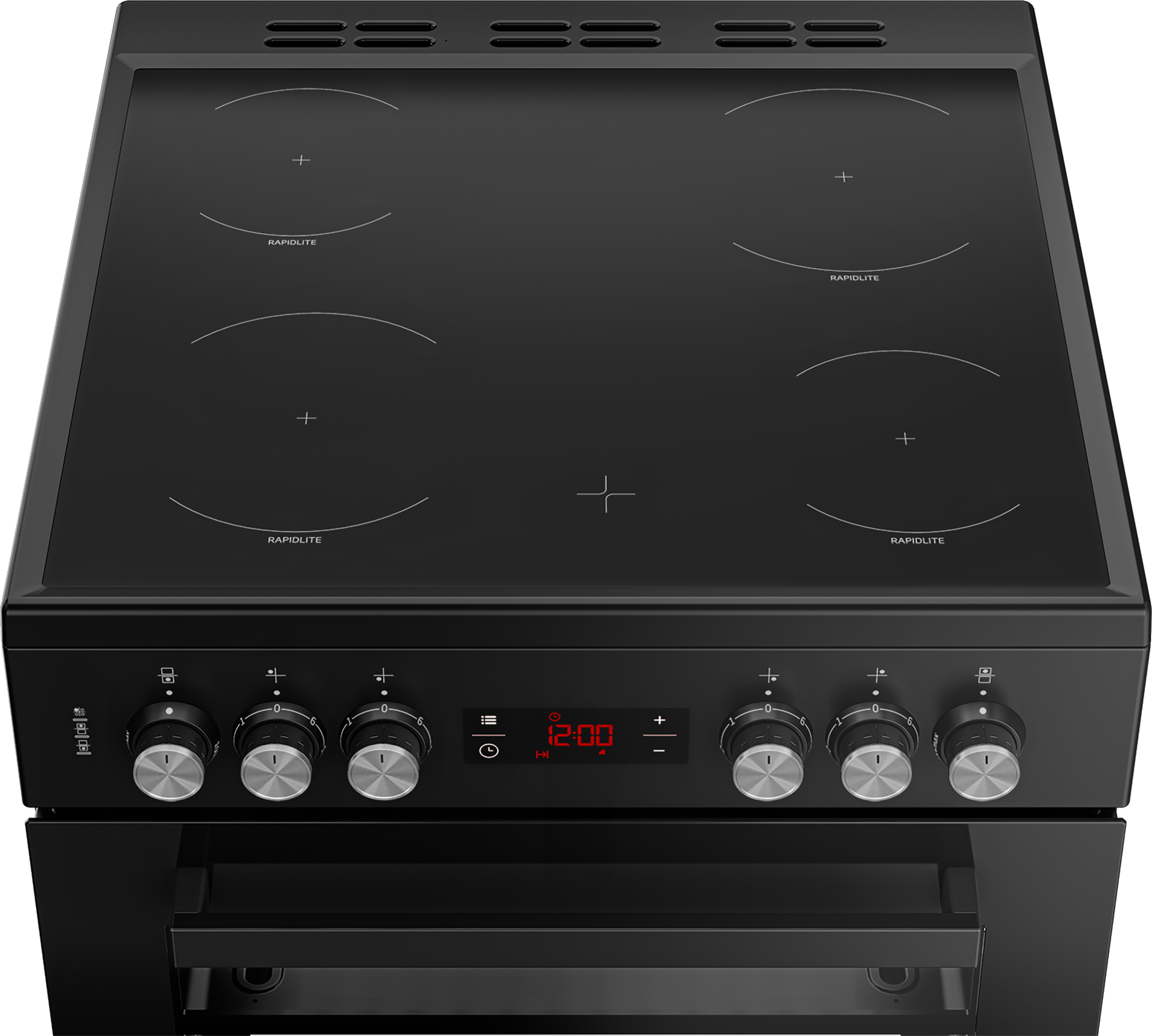 The ceramic hob features four Rapidlite zones that deliver quick and efficient pan heating. Safety is paramount with hot hob warning lights that remain lit until the surface is safe to touch, making it ideal for families with children.