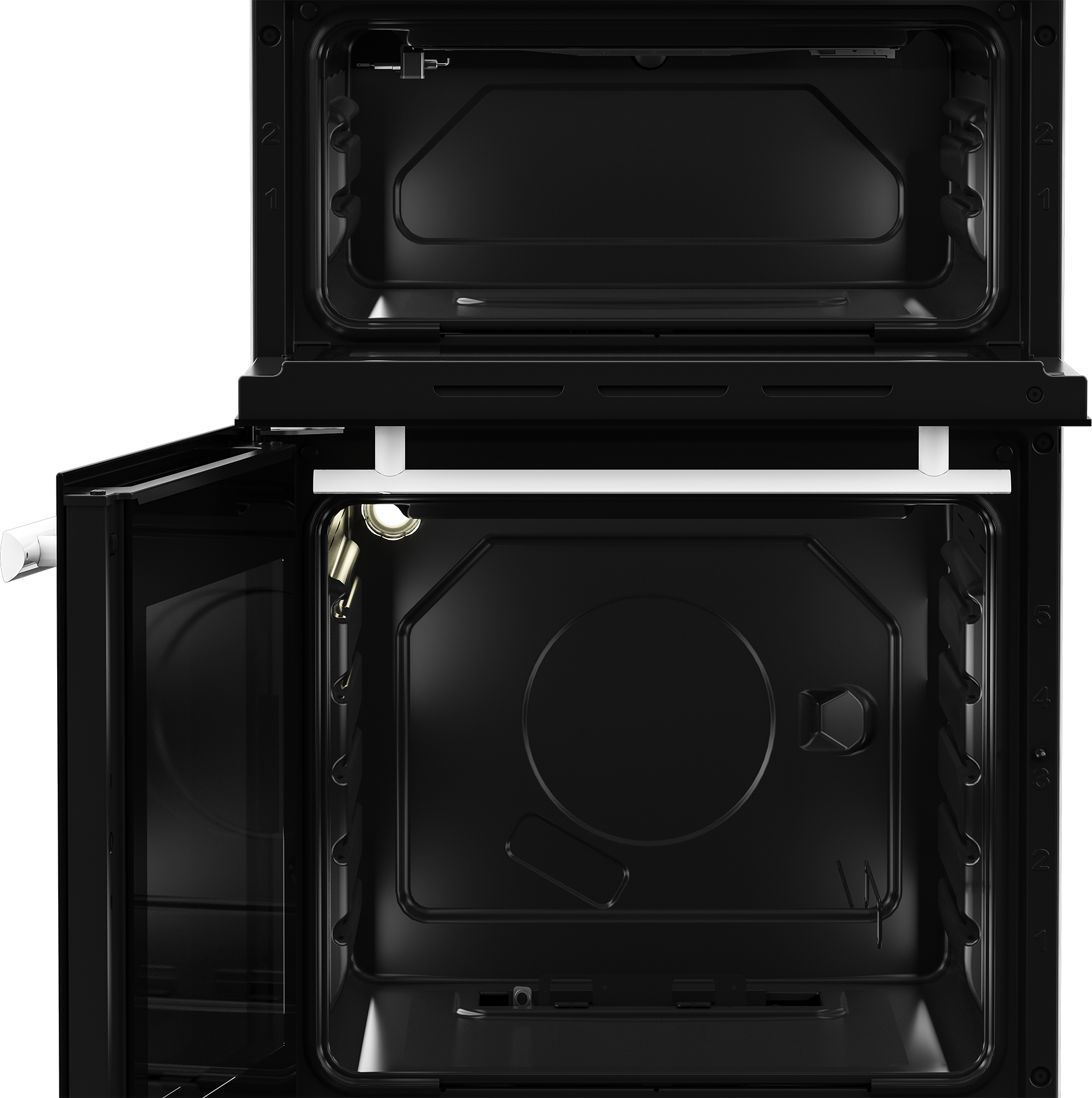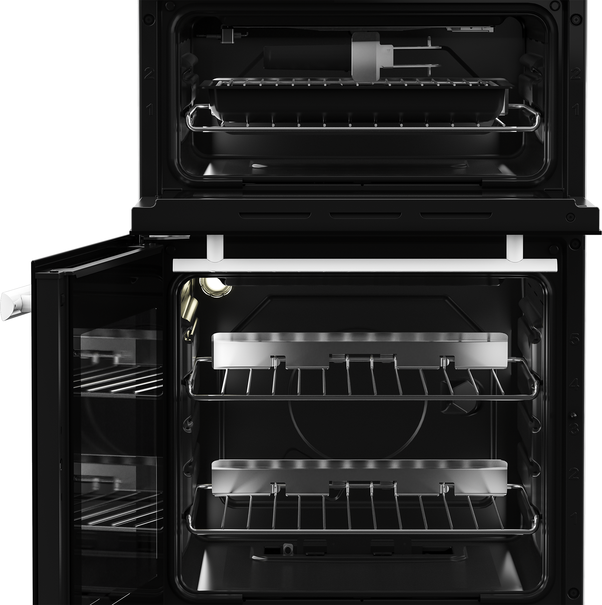 The cooker includes an interior light in the main cavity, allowing you to monitor your food without opening the door and losing heat. The digital clock with a countdown timer helps you keep track of cooking times accurately. The dial controls and triple-glazed glass doors enhance energy efficiency and ease of use.