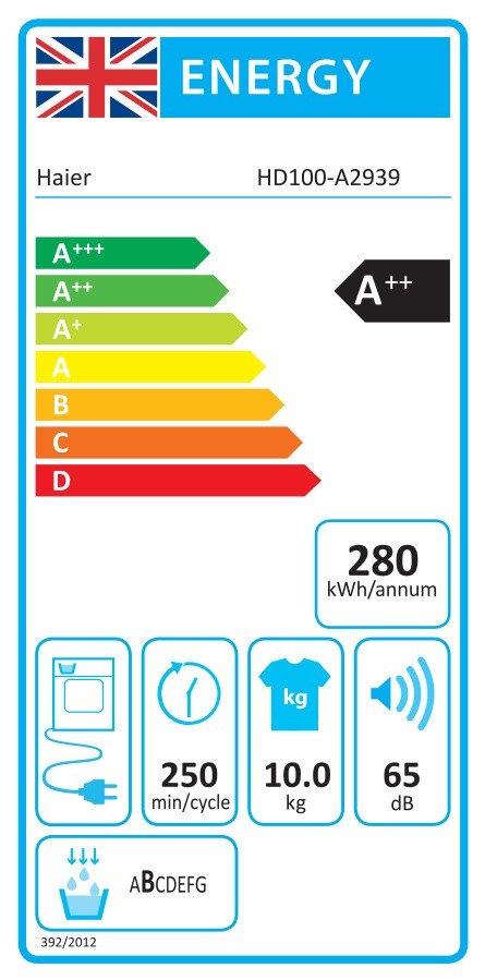 Haier's HD100-A2939EUK heat pump tumble dryer combines innovative technology and user friendly design for an outstanding drying appliance. Built to significantly reduce energy consumption and ensure ultra hygienic results, this dryer is designed to meet the needs of modern households while providing optimal clothing care.