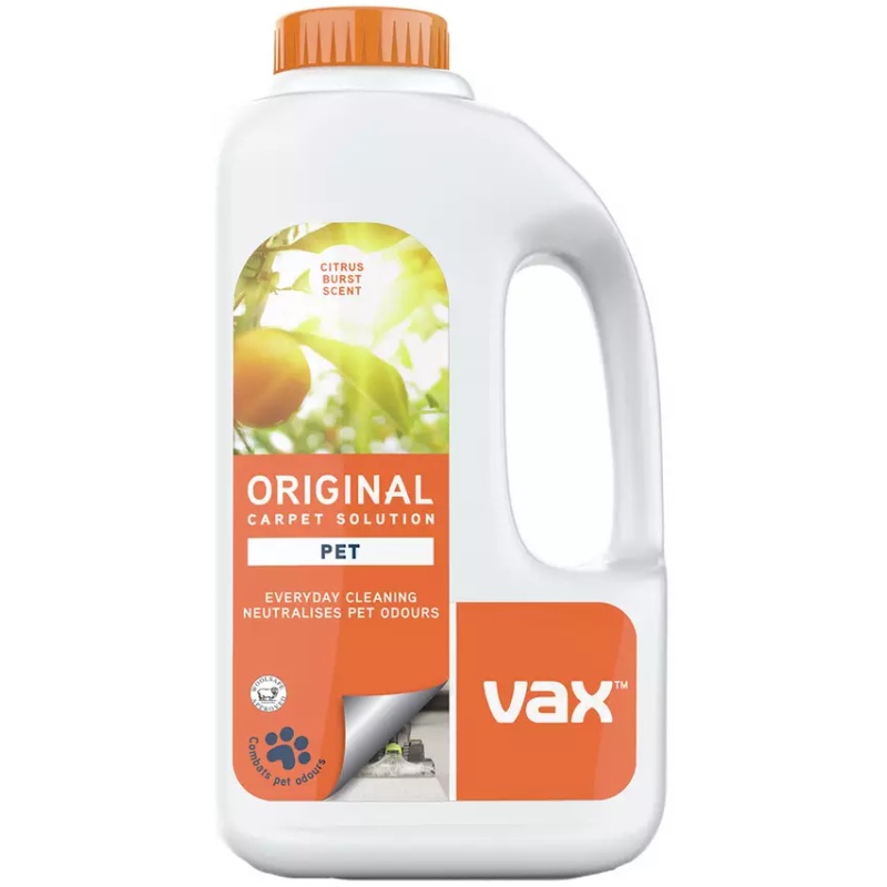 The Vax 1-9-142054 original citrus pet carpet cleaning solution is designed to keep carpets fresh, clean, and free from lingering pet odours. Specially formulated for use with all Vax Carpet Washers, the solution removes everyday dirt while leaving behind a citrus burst fragrance.