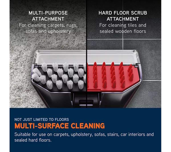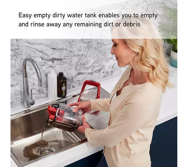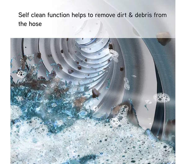 The integrated self-clean function flushes debris and hair from the hose after use, helping to maintain performance. Supplied with a hard floor scrub attachment, multi-purpose attachment and cleaning solution, it is ready to use straight away. Its compact design ensures it can be stored neatly in smaller spaces when not in use.
