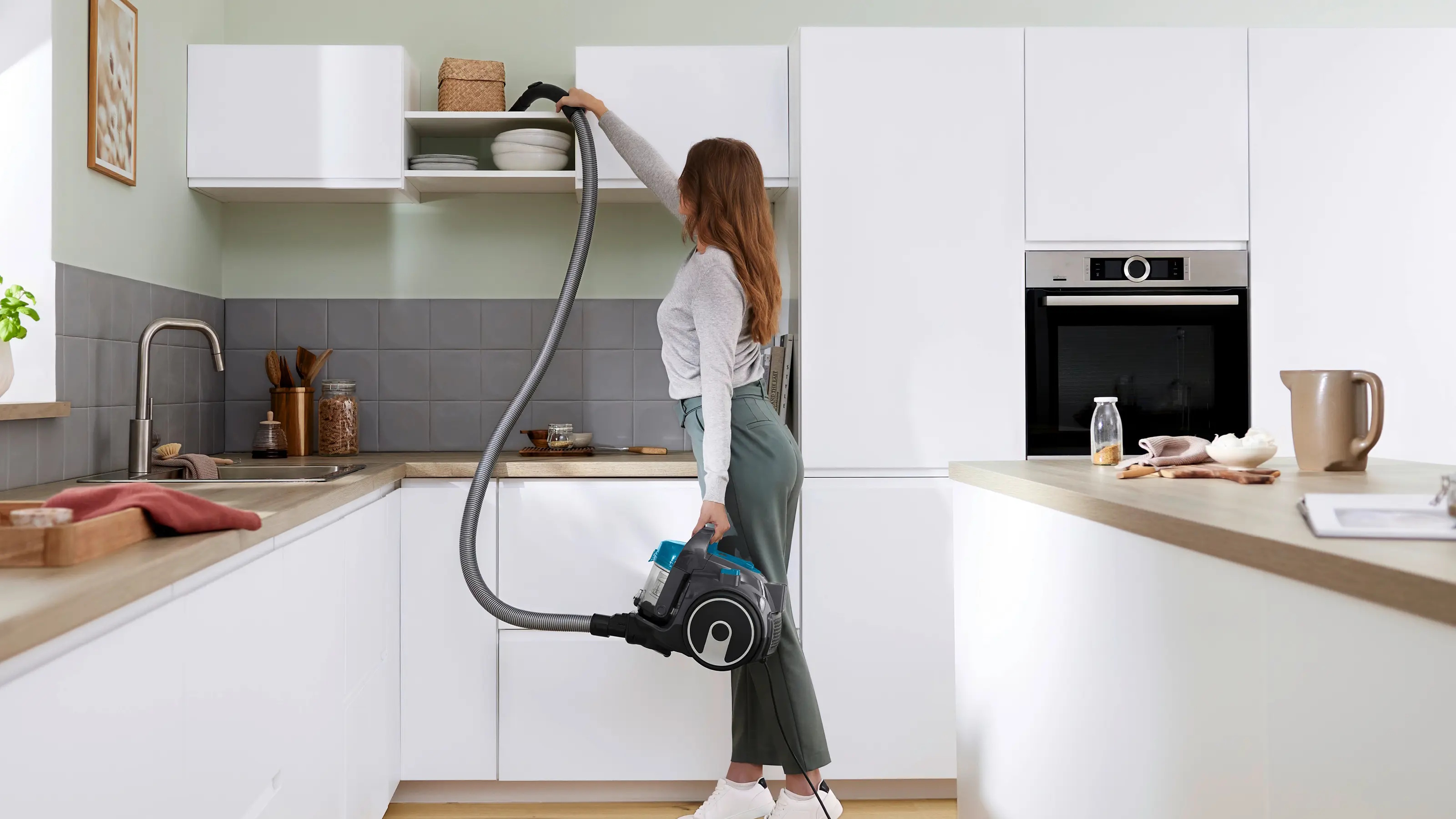 An ergonomic design supports comfortable use during carrying and operation. The integrated hose storage solution allows the appliance to be stored neatly in smaller spaces, making it ideal for homes where storage is limited.