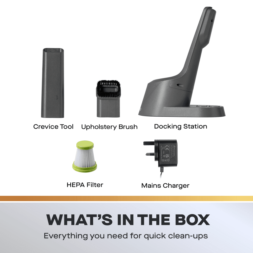 The 120ml dust tank is easy to empty, making clean-up simple and mess-free. A crevice tool and upholstery brush are included for targeted cleaning in tight or delicate areas such as skirting boards, car interiors, curtains and cushions.