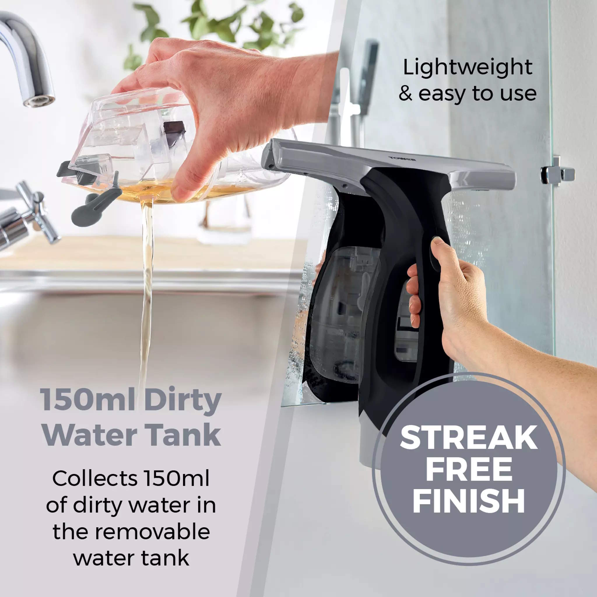 The 150ml water tank collects all the dirty water as you go. It's quick to remove, empty, and rinse so you're always ready for the next window or surface.