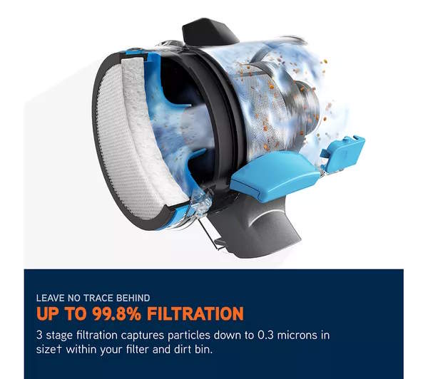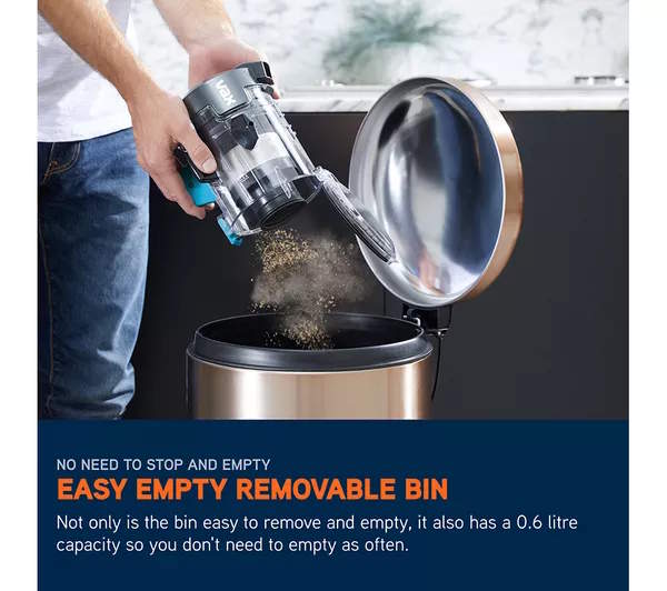 The 0.6 litre bin removes easily for quick, mess-free emptying, while the washable dustvault 3 stage filtration system captures fine dust and allergens, making it suitable for allergy sufferers. A detachable handheld unit and onboard tool storage ensure you have everything you need for cleaning stairs, upholstery and even your car.