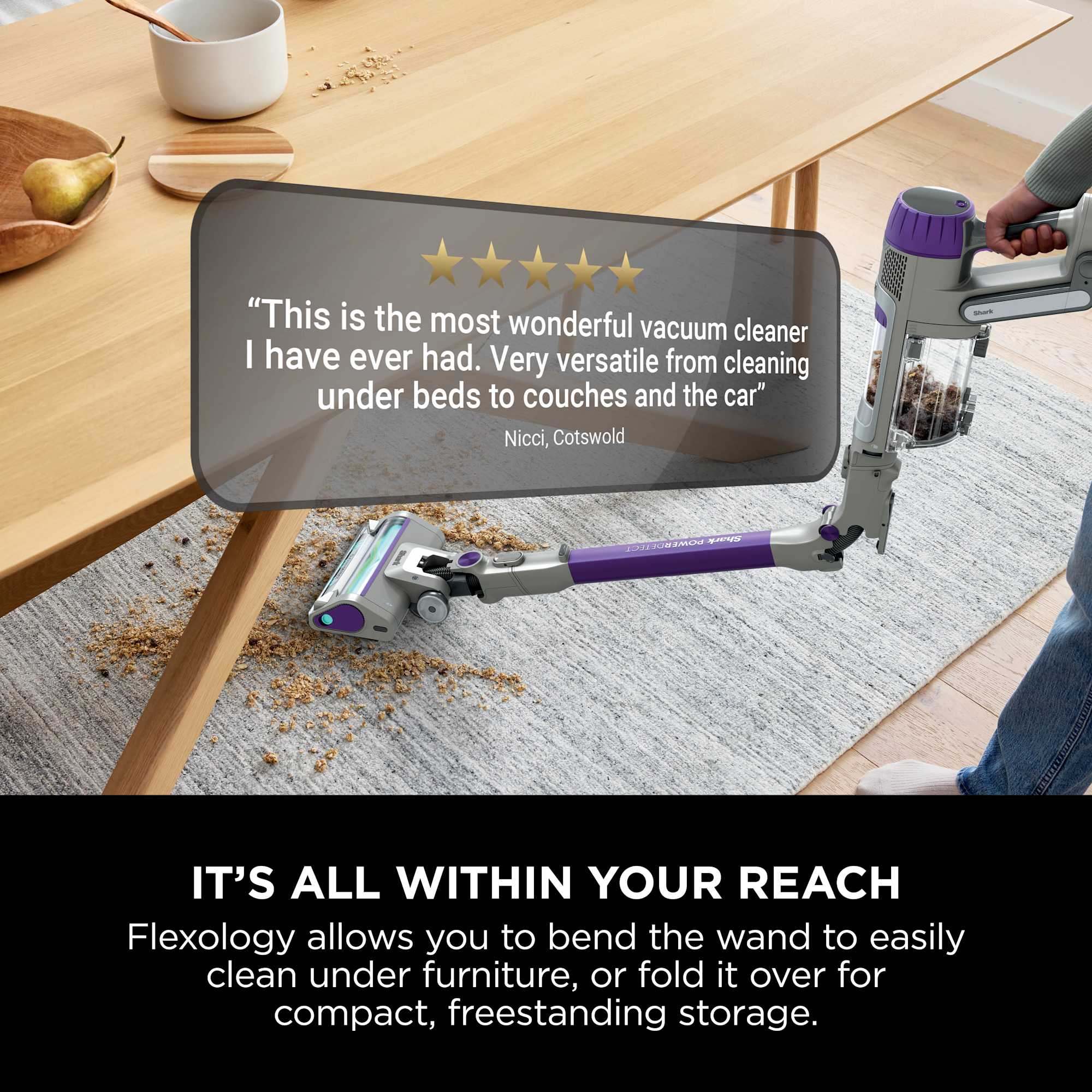 Convert it to a handheld vacuum for stairs, furniture, or tight spaces. Use the Motorised Pet Tool for deep-cleaning pet hair, the Duster Crevice Tool for tight corners, and the Multi-Surface Tool for versatile cleaning.