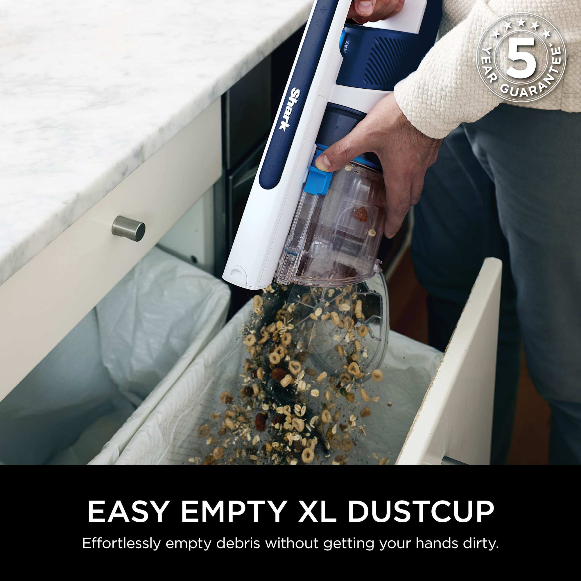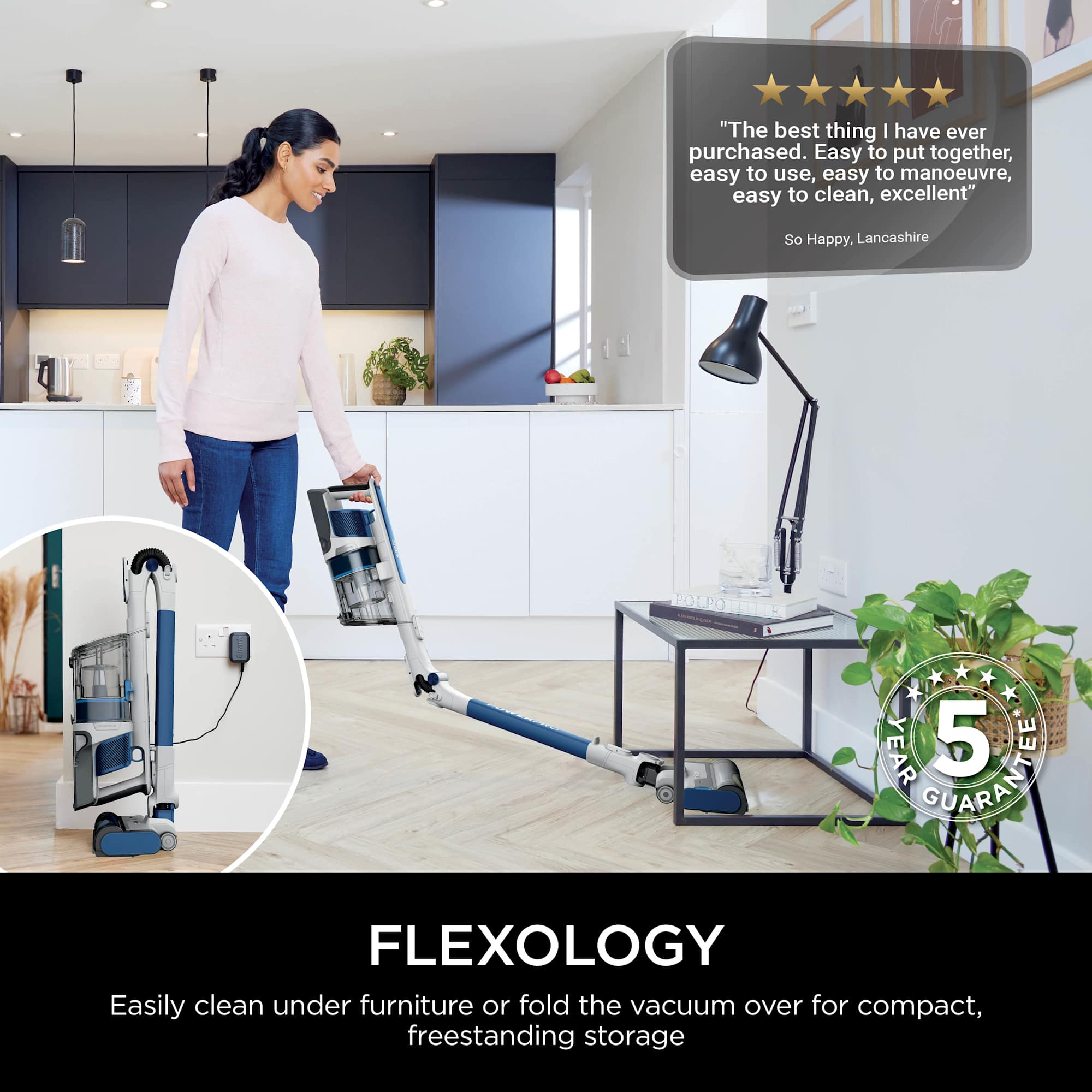 Flexology allows the wand to bend for easy cleaning under low furniture and fold down for compact, freestanding storage. LED headlights illuminate darker areas, making it easier to identify dust and debris. The large dust cup capacity supports extended cleaning sessions with fewer interruptions.