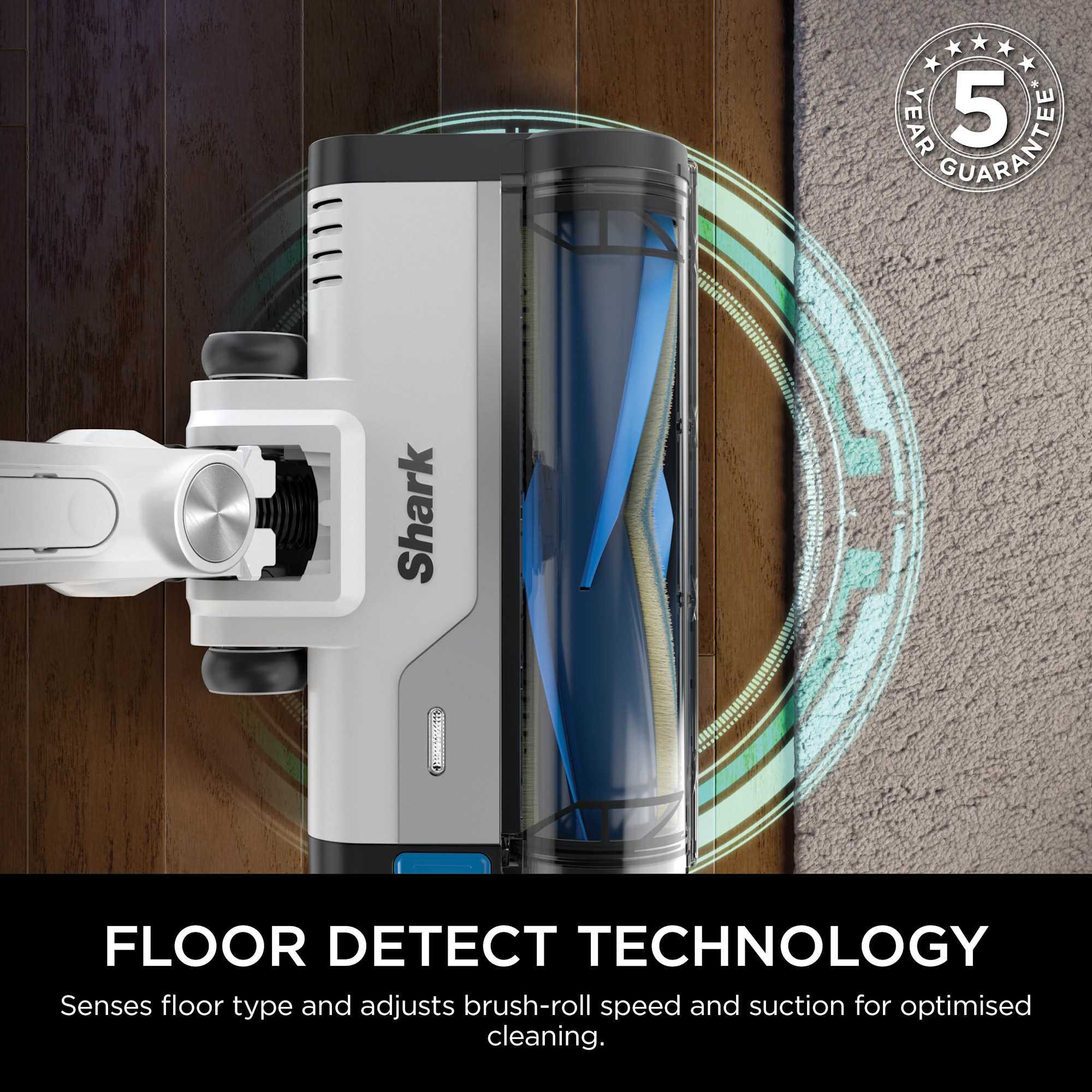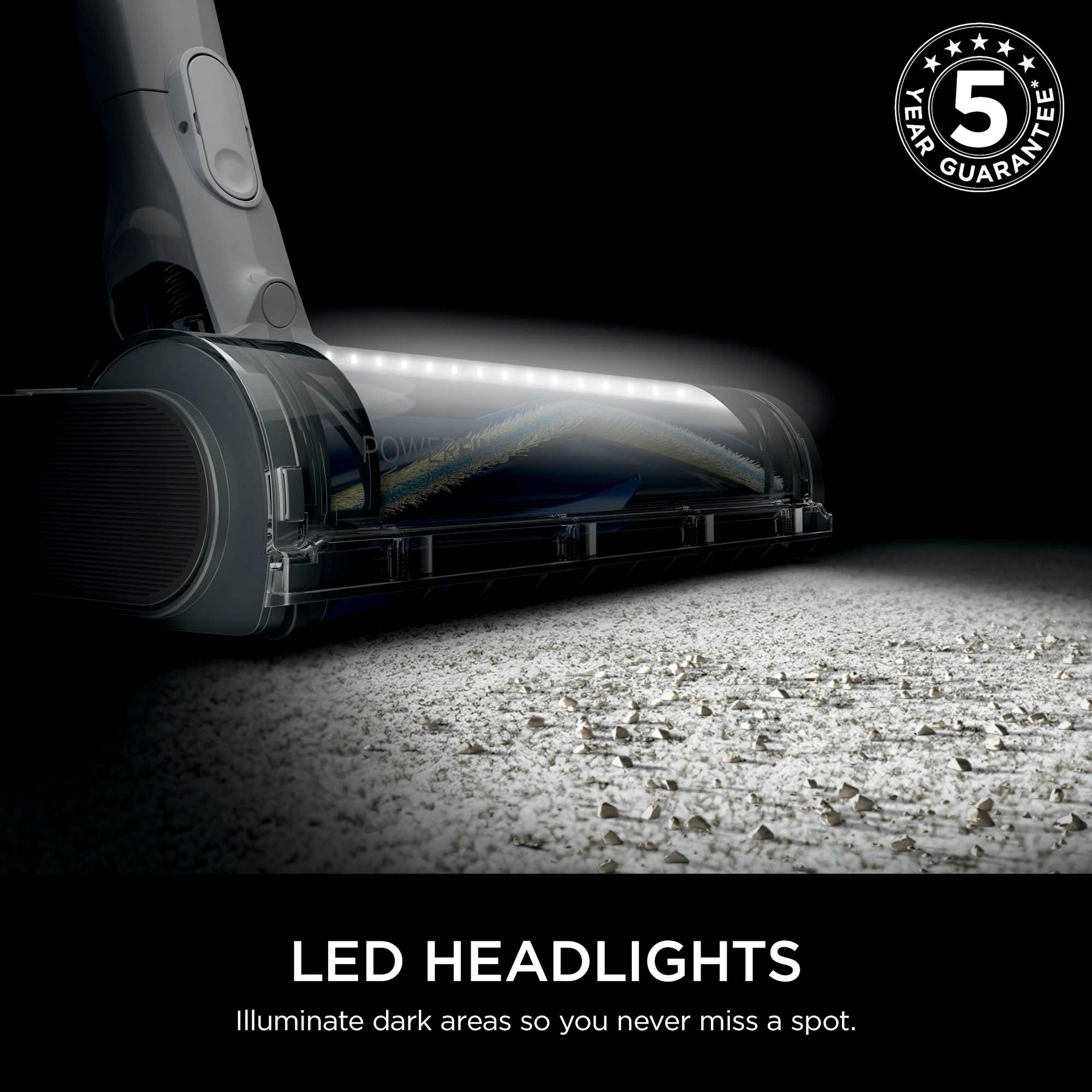 The PowerFins multi-surface floorhead maintains continuous contact with floors to ensure thorough debris pick-up on both carpets and hard floors. Integrated FloorDetect Technology automatically senses floor type and adjusts brush-roll speed and suction to optimise cleaning performance across different surfaces.