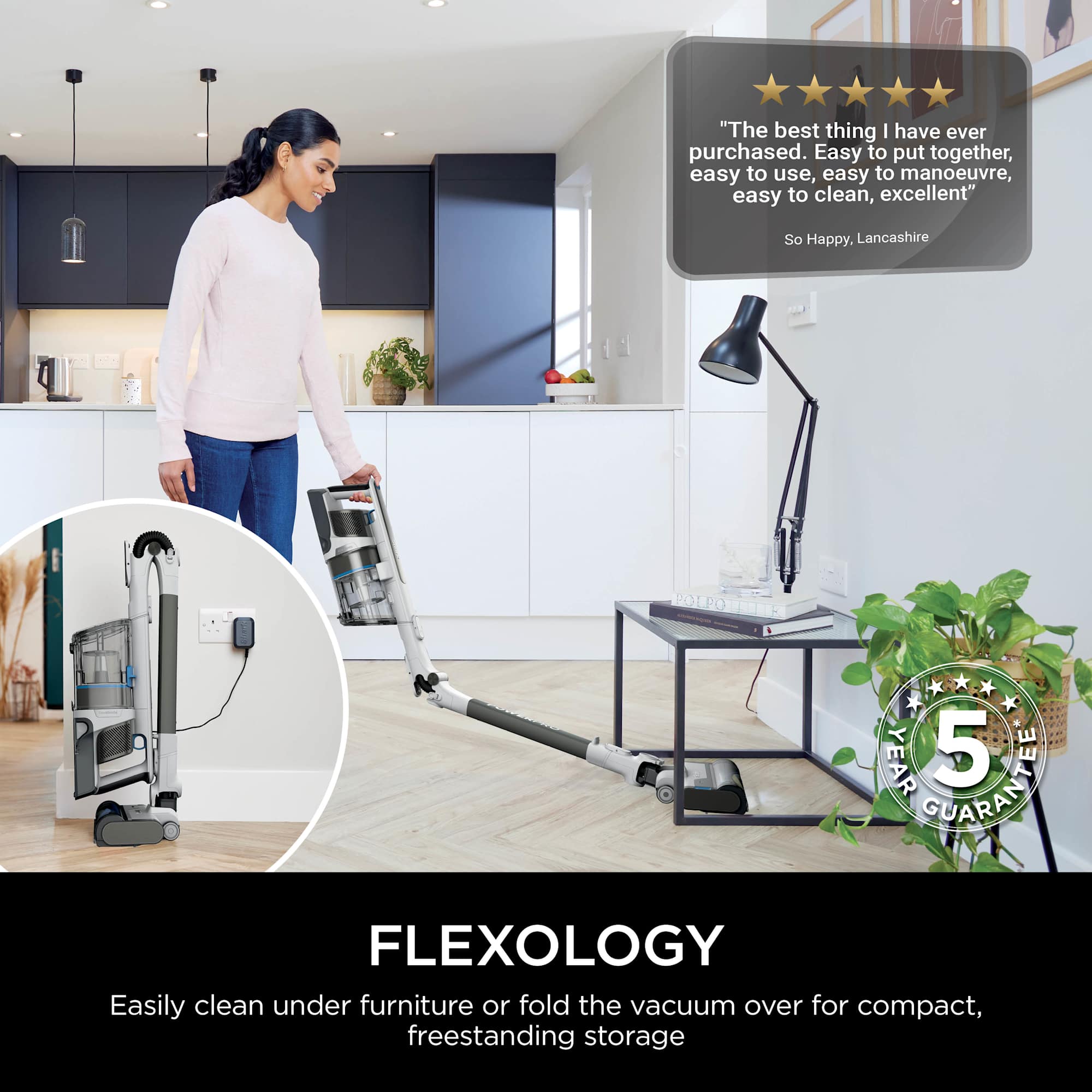 Flexology allows the wand to bend for easy access under low furniture and fold down for compact, freestanding storage. Integrated LED headlights illuminate darker areas, helping to reveal hidden dust and debris, while the XL dust cup enables longer cleaning sessions with fewer interruptions.