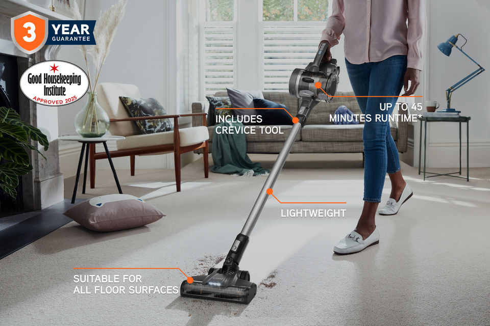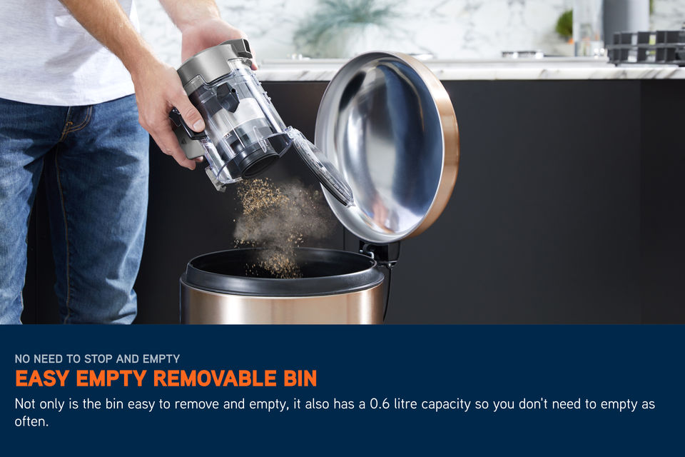 Capturing up to 99.8% of particles as small as 0.3 microns, this vacuum supports a cleaner indoor environment. Integrated LED headlights improve visibility in low-light areas, and the 0.6L easy-empty removable bin allows for hygienic and convenient disposal. Supplied with a wall mount, charger and removable battery, it offers a complete and efficient cordless cleaning system.