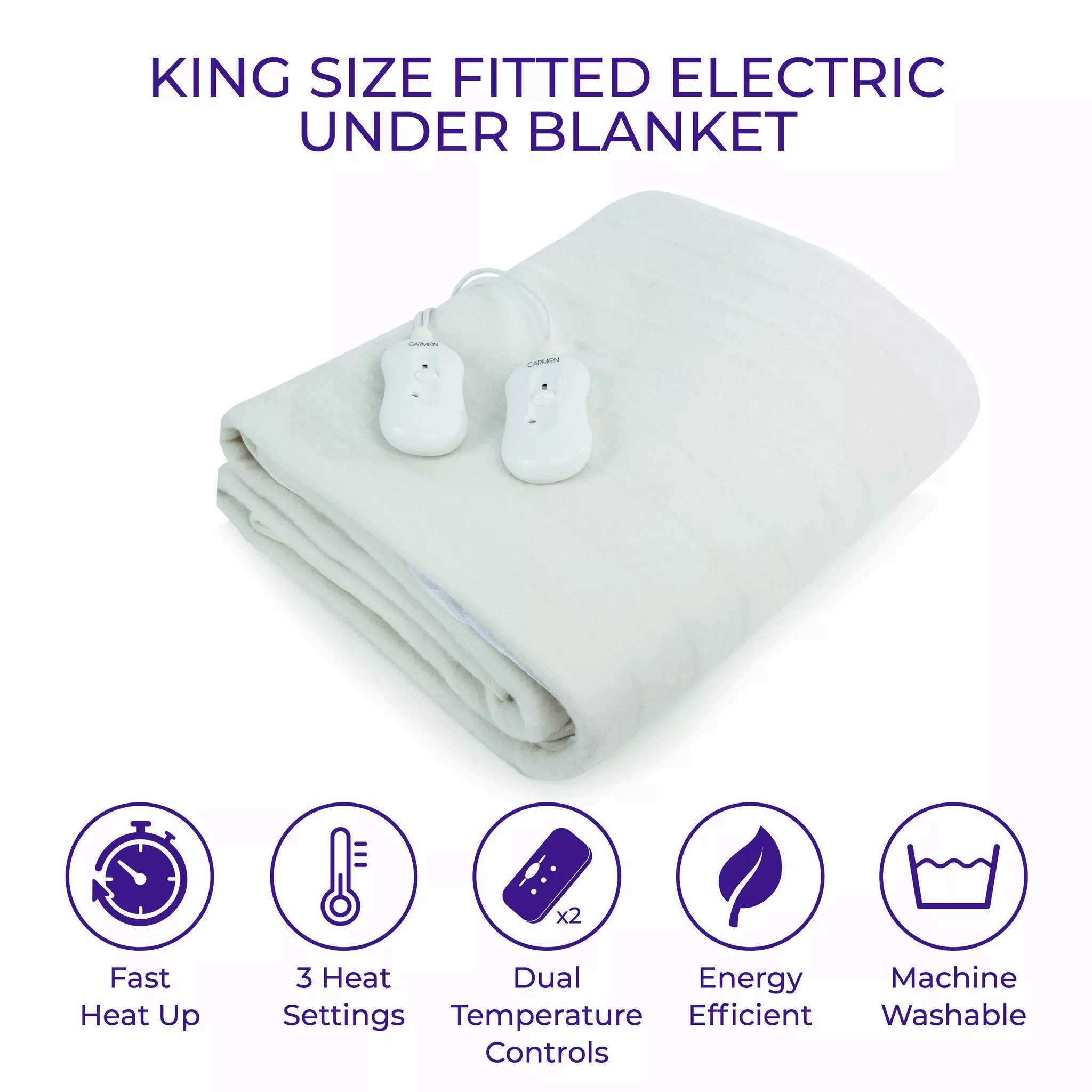 The blanket includes integrated overheat protection for added safety, giving users peace of mind during overnight use. The fully fitted design with a deep elasticated skirt ensures a secure fit on king-size mattresses, while the controllers can be detached for straightforward machine washing. Combining functionality, comfort, and safety, the Carmen king size electric blanket offers an effective solution for maintaining warmth while managing energy use, making it a practical choice for modern households.