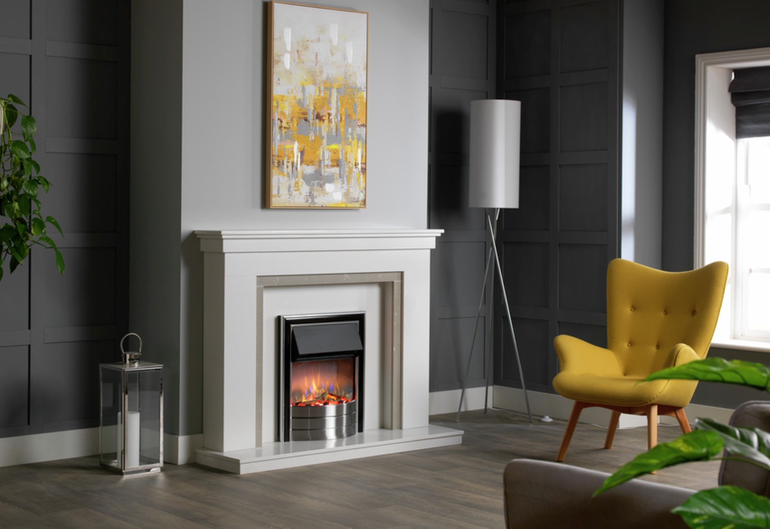 Choose from a variety of fuel beds, including coals, logs, crystals, and pebbles. The freestanding design, with the option to use a spacer kit, allows for flexible placement in your home. The suite's black and chrome finish combines matt and reflective elements, while the steel core materials ensure durability.