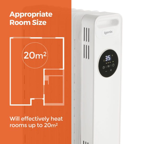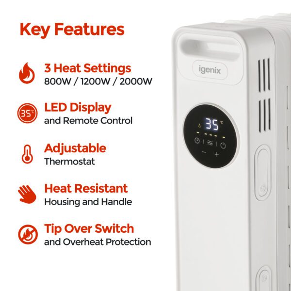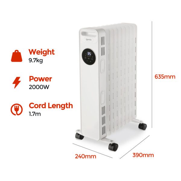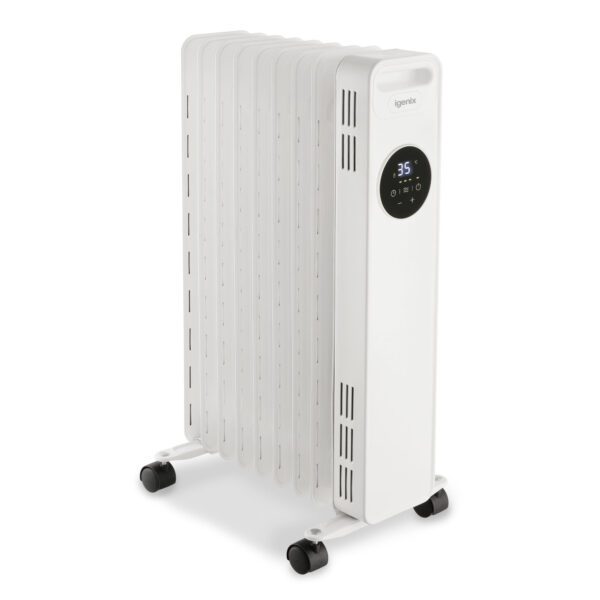 The iGenix IG2621 is a digital oil filled radiator with 2000W of power so you can keep out the cold this winter with instant heat. Save on central heating by using a portable oil filled radiator to warm up a room in a matter of minutes. The radiator has a host of features such as a Digital LED Control Panel and Remote Control to easily adjust the heat, Rolling Castors for easy manoeuvrability around your home and Heat Resistant Housing to make it safe for children and pets.