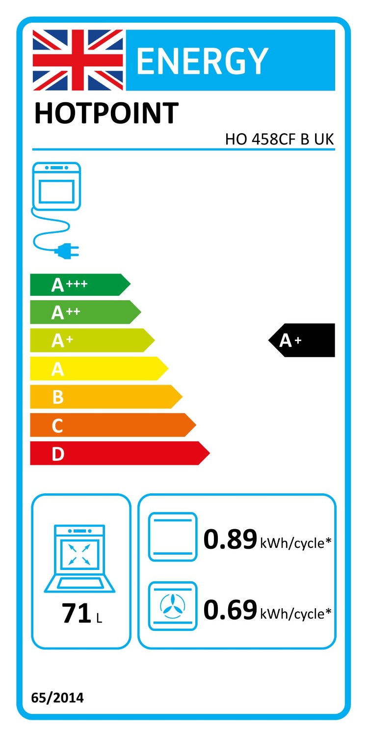 With an energy efficiency class of A+, Hotpoint's HO458CFBUK is designed to consume less power while delivering high performance. The energy consumption for forced air convection is 0.69 kWh, and for conventional cooking, it is 0.89 kWh, making it a highly economical choice for your kitchen.