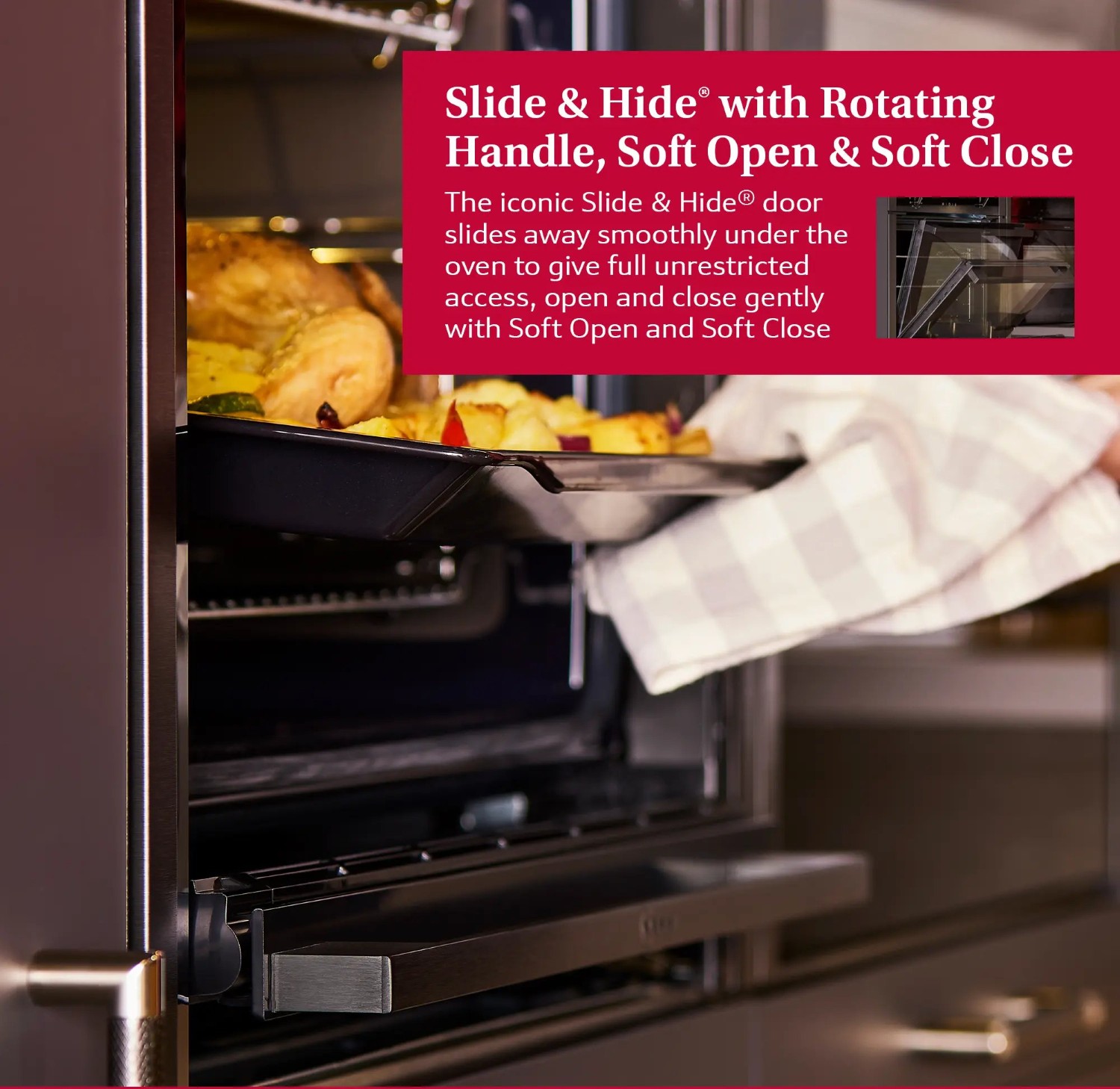The Slide & Hide design offers unrestricted access to the oven cavity by allowing the door to slide away completely. A 4.1 inch Full Touch TFT Display provides an intuitive menu for easy navigation and smart cooking. The oven also includes two combination grids and a universal pan, enhancing its versatility.