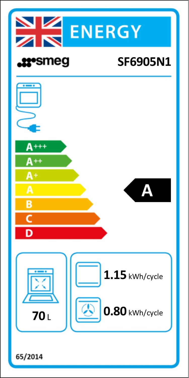 Rated with an energy efficiency class A, the Smeg SF6905N1 oven ensures low energy consumption while delivering high performance. The oven's tangential cooling system and triple-glazed door help maintain a safe and efficient cooking environment. With a net volume of 70 litres, this oven provides ample space for all your cooking needs.