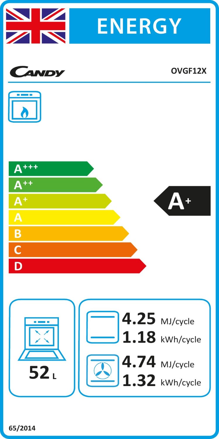 The OVGF12X has a 52 litre cavity capacity, providing ample space for all your cooking endeavours. The conventional oven type ensures even heat distribution, making it ideal for baking, roasting, and more. With an energy efficiency class of A+, Candy's OVGF12X is designed to consume less energy while still delivering excellent cooking results.