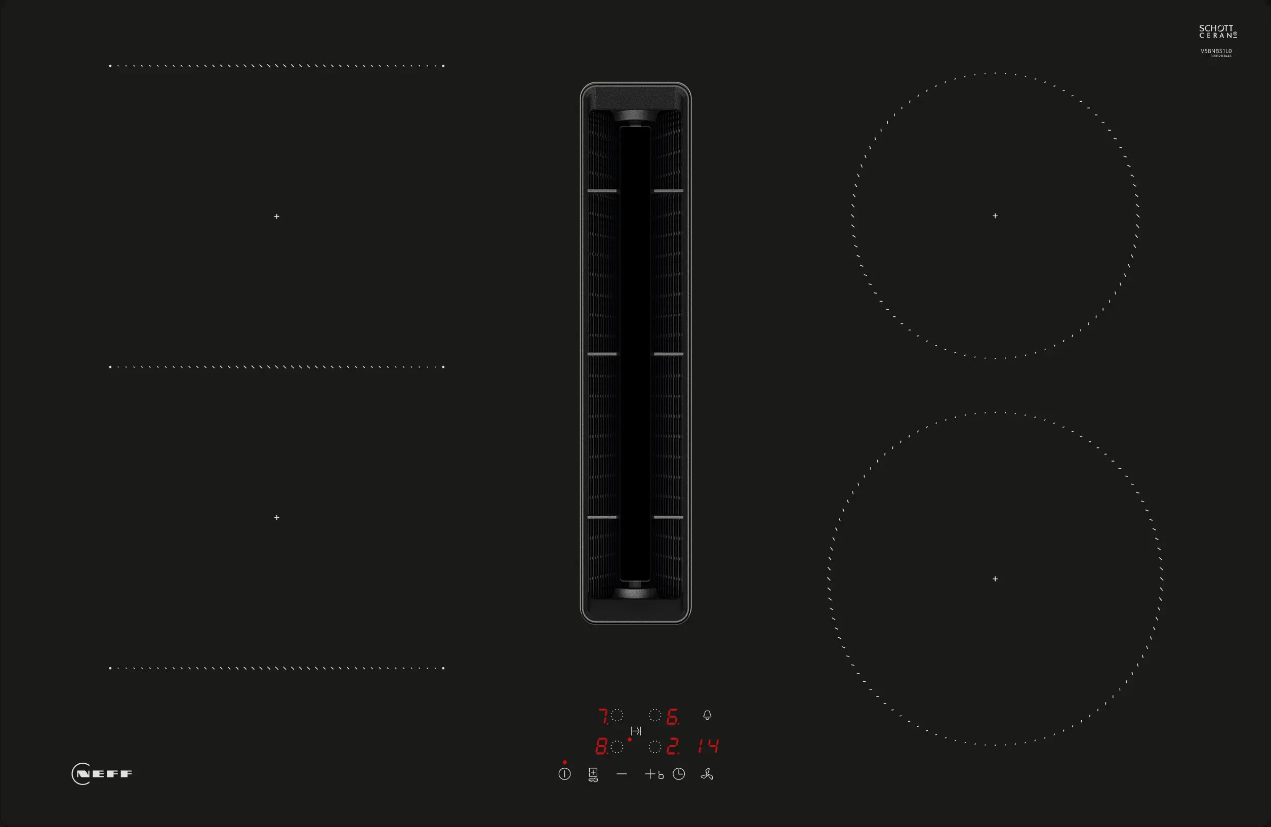 Neff's V58NBS1L0 N50 vented induction hob combines inventive design with advanced cooking technology, making it a perfect addition to any modern kitchen. With powerful induction zones, integrated ventilation, and user friendly controls, this hob offers both efficiency and convenience for all your cooking needs.