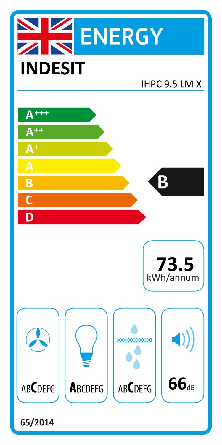This chimney hood boasts a B energy efficiency class, ensuring it operates effectively while keeping energy consumption low. With a lighting efficiency class of A and grease filtering and fluid dynamic efficiency classes of C, Indesit's IHPC95LMX balances performance with energy savings, making it a smart choice for eco-conscious households.