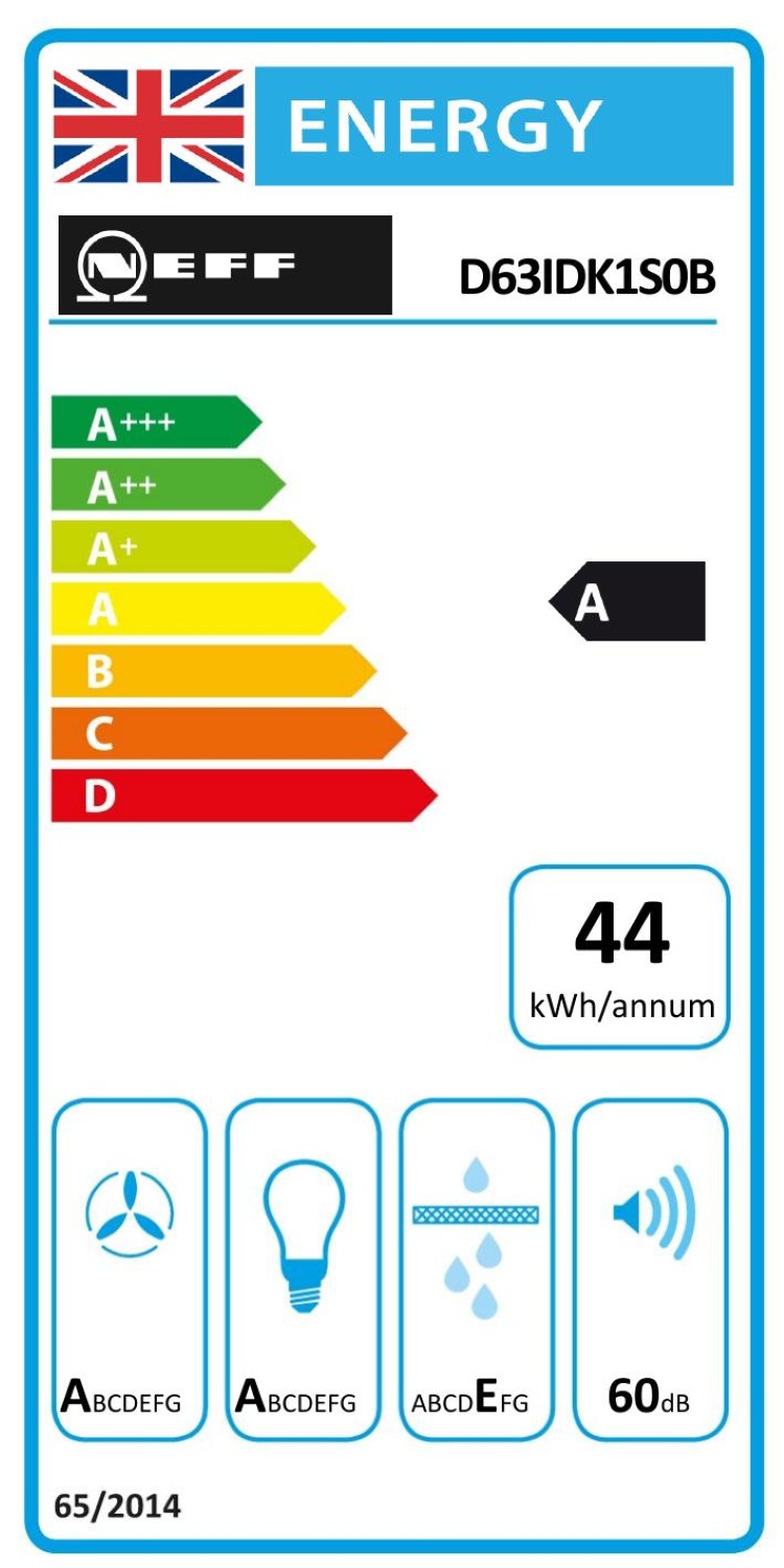 The D63IDK1S0B offers a maximum air extraction rate of 430 m³/h, with a boost position that increases the rate to 550 m³/h for intense cooking sessions. The convertible operating mode allows for both ducted and recirculating air options, providing flexibility to suit your kitchen setup. With an energy efficiency rating of A and an annual energy consumption of just 43.8 kWh, it combines performance with cost effectiveness.