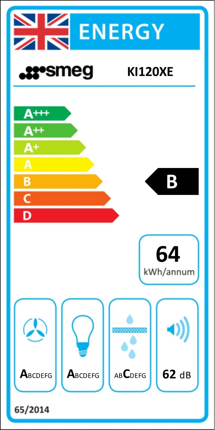The Smeg KI120XE cooker hood is equipped with electronic controls and a clear LED display for easy operation. It offers three standard speeds plus an intensive speed for quick extraction when needed. The automatic switch-off function allows the hood to continue purifying the air for a set time before turning off, providing convenience and energy savings.