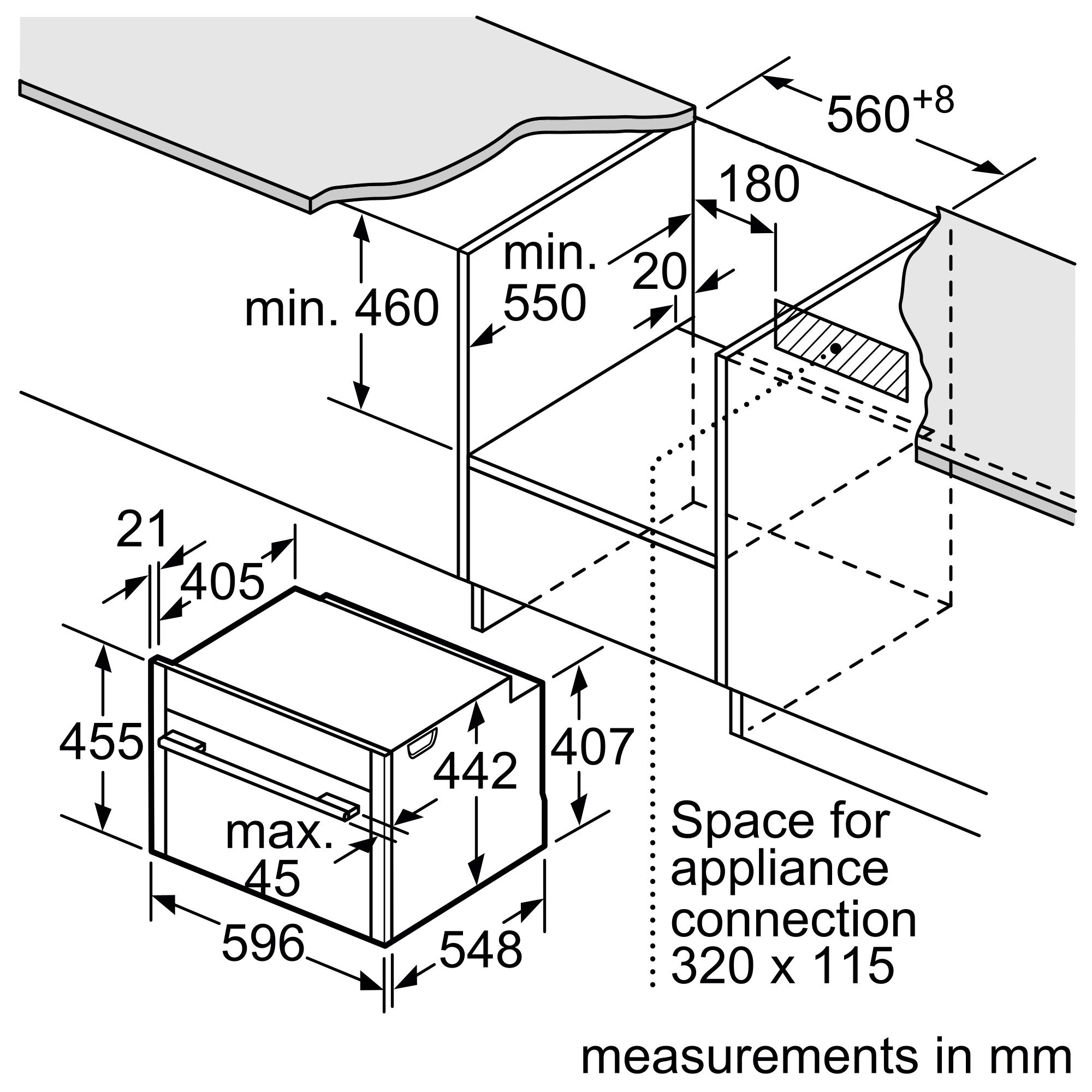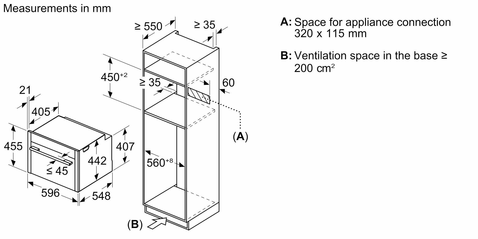 This built-in compact oven features a net main oven capacity of 45 liters, making it ideal for various cooking tasks. Its dimensions are 59.6cm in width, 45.5cm in height, and 54.8cm in depth, ensuring a perfect fit in your kitchen setup.
