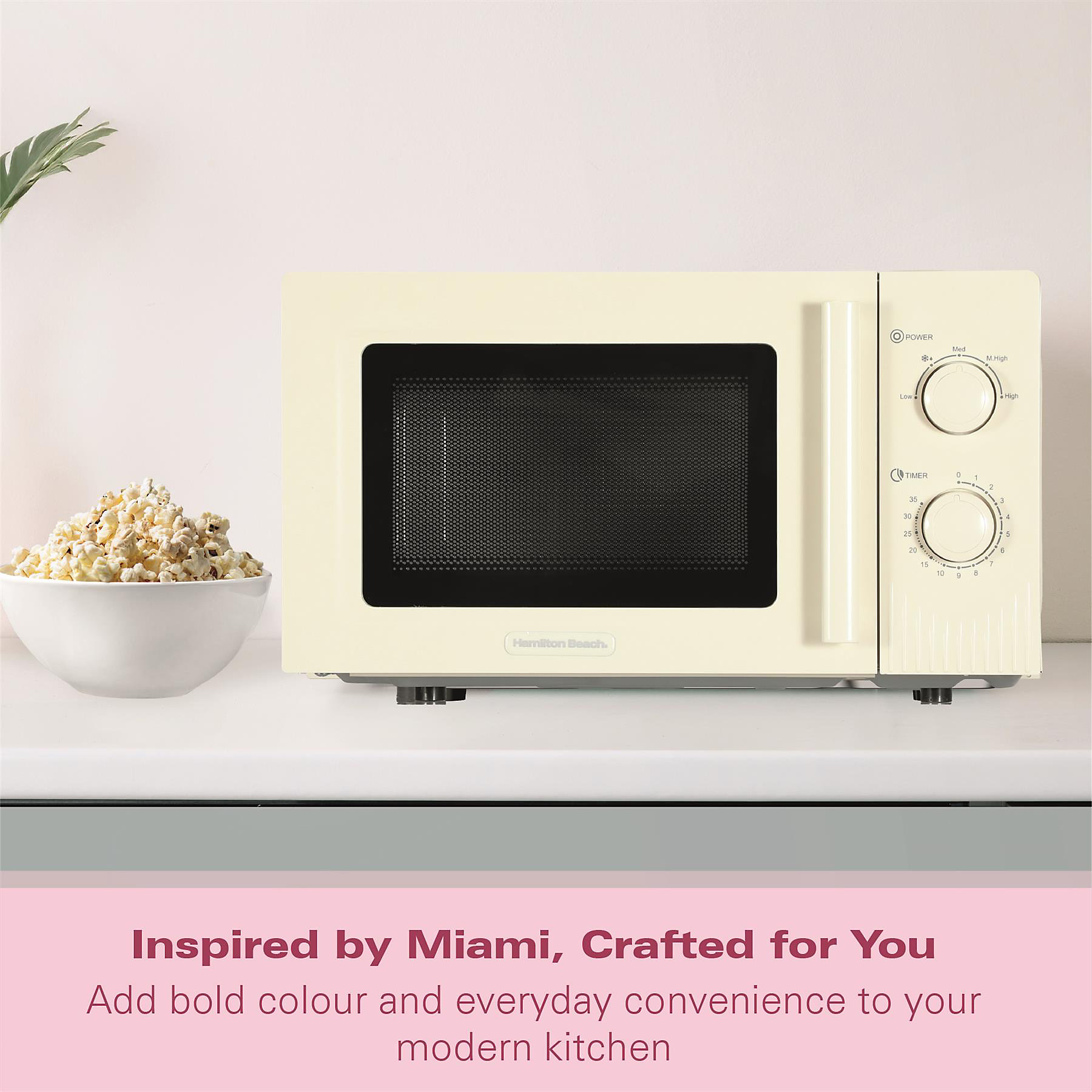 The Hamilton Beach HBMX20S Miami Cream Microwave has a 20L capacity and stylish cream finish making it fit seamlessly into any modern kitchen.