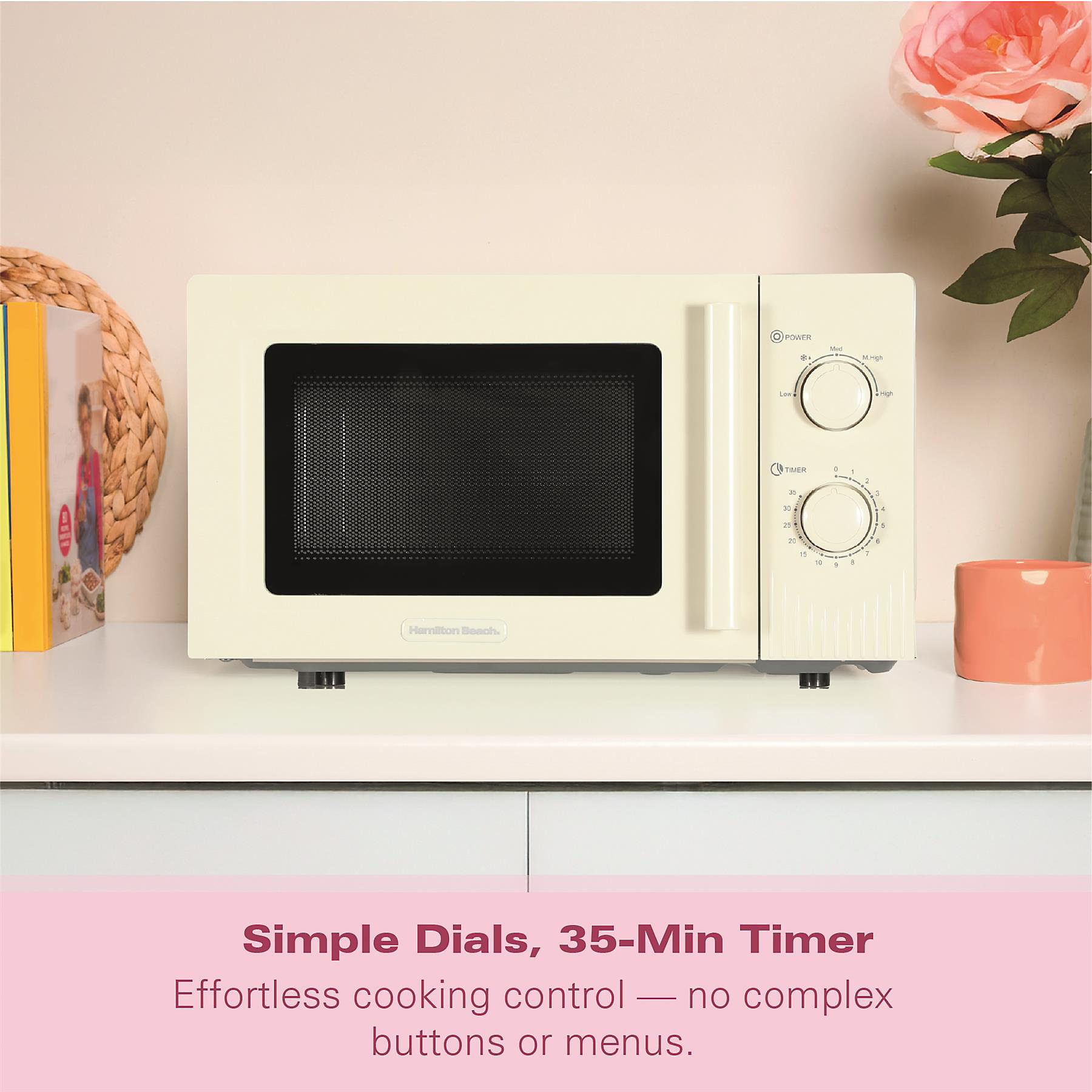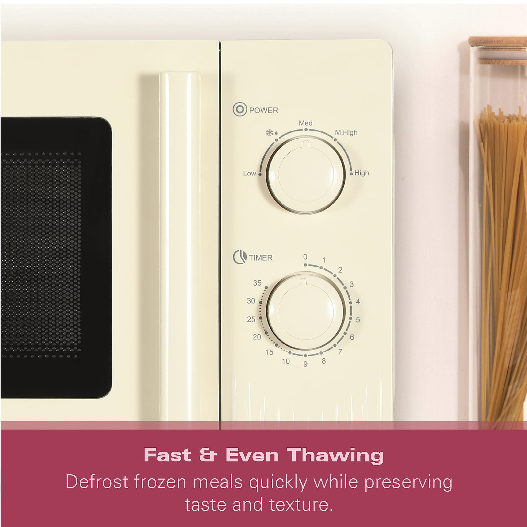 With 800W of power and five adjustable cooking levels, you can heat, cook, and reheat with confidence. The dedicated defrost function helps you prepare meals straight from frozen with ease. It thaws food evenly and efficiently, saving time. Manual dials and a 35 minute timer provide straightforward, precise operation.
