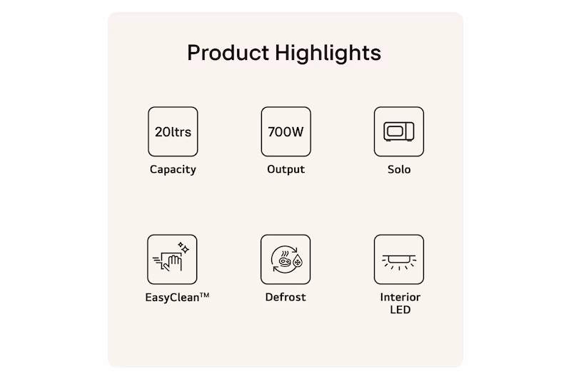 The LG MS2042D solo microwave oven is designed for efficient and reliable everyday use. With intuitive touch controls, advanced EasyClean technology and a stylish black finish, it delivers practical performance in a refined, space-efficient design suitable for modern kitchens.