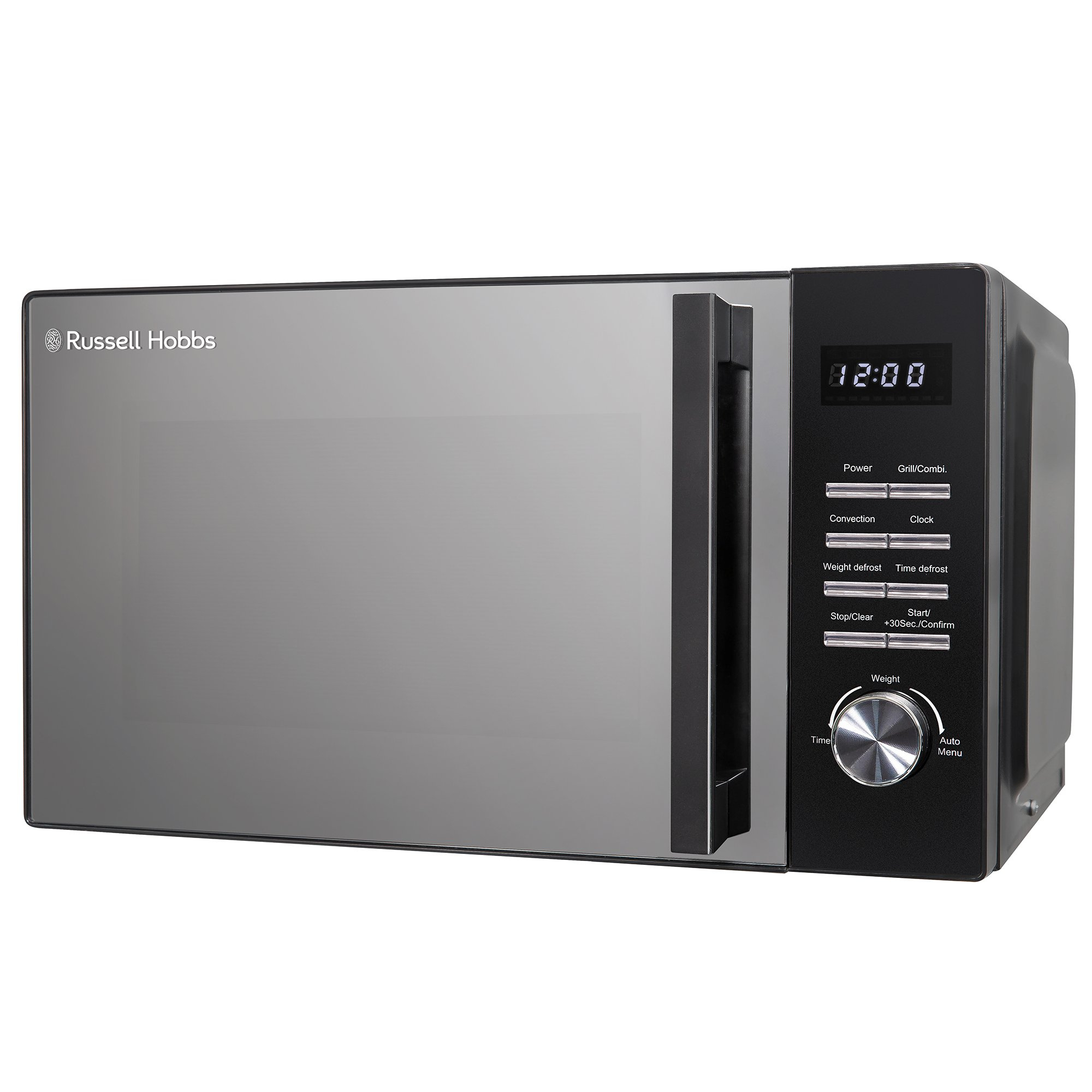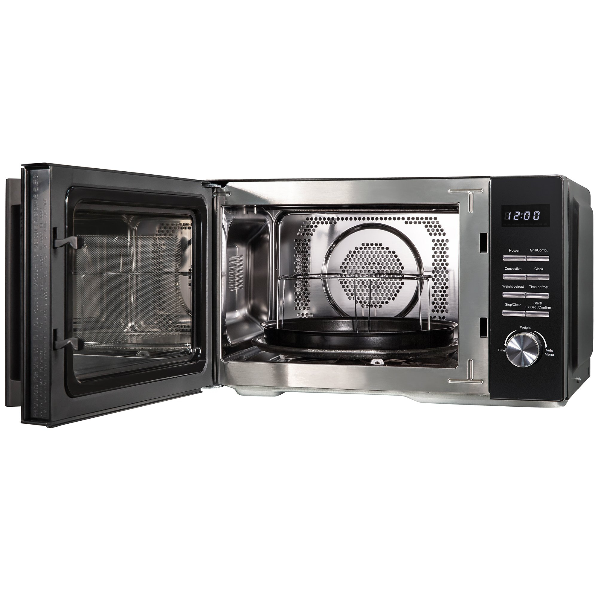 This 23L black combination microwave is all you need for flexible and fuss-free cooking. With its mirror door and chrome details, it's a style statement on your countertop.