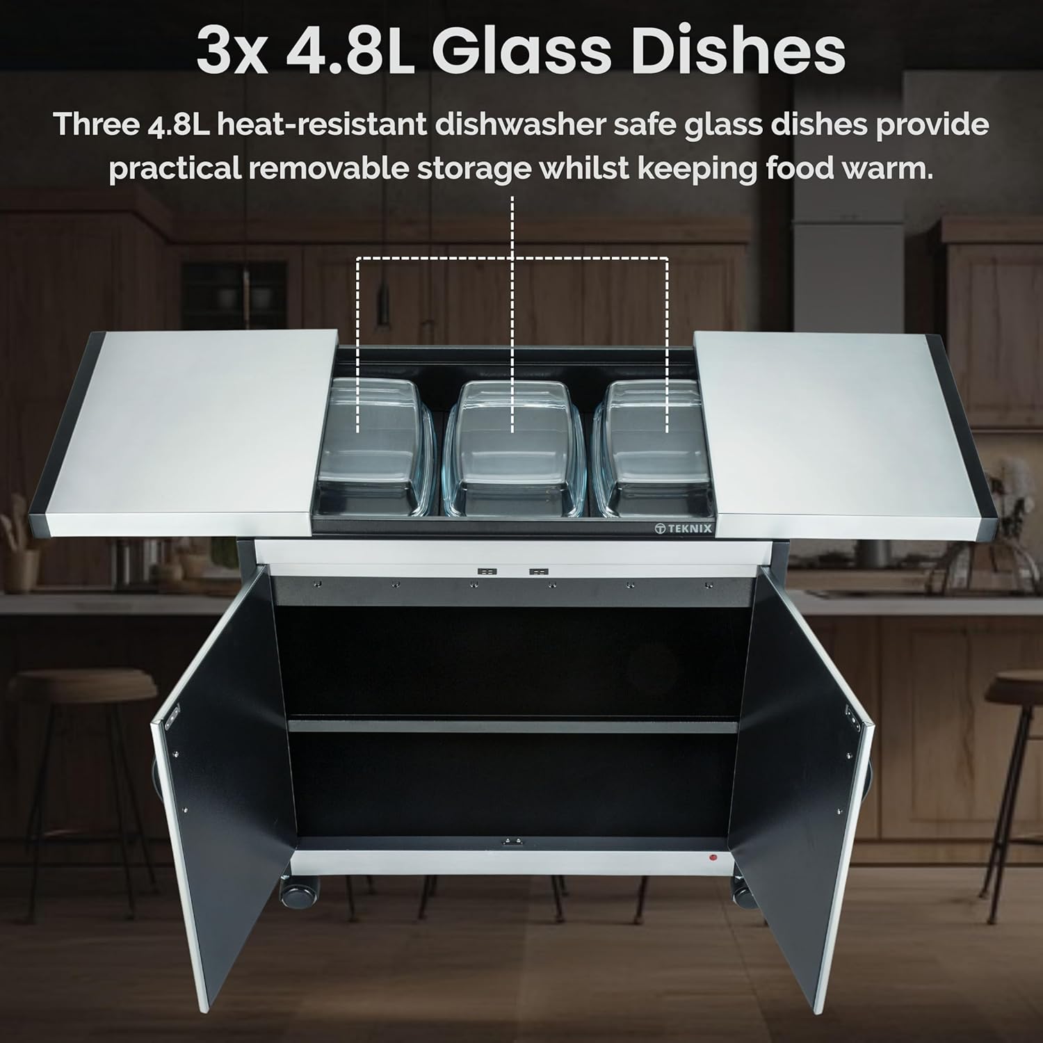Supplied with three heat-resistant rectangular glass dishes (4.8L total capacity), this trolley makes serving mains, sides, and vegetables effortless. The wrap-around sliding lid with integrated handles provides easy access while helping to retain heat when closed, keeping food at its best for longer.