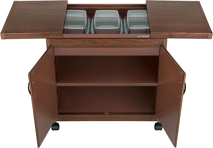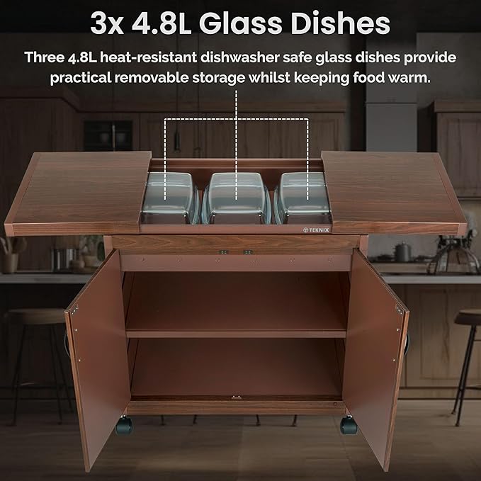 The Teknix TK2HOSTIX electric hostess heated food warming trolley is the perfect appliance for keeping food warm and ready to serve. Designed with three heated levels, integrated glass serving dishes, and a stylish mahogany finish, it is ideal for dinner parties, family meals, and special occasions where timing and presentation matter.