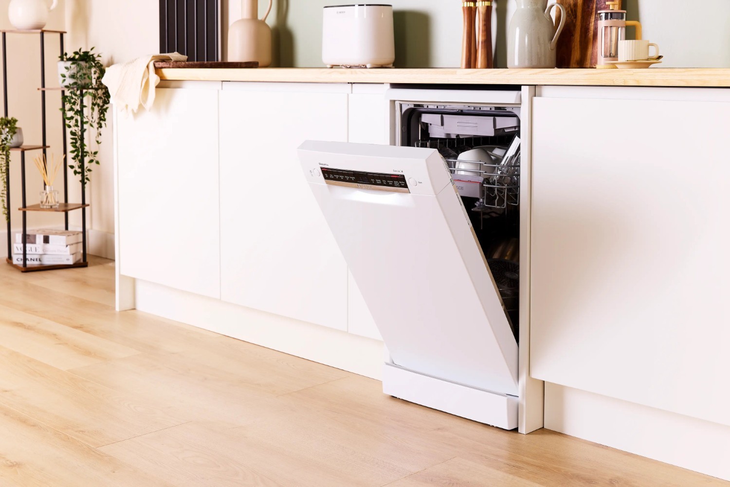 Bosch's SPS4HMW49G slimline dishwasher is a compact and efficient appliance that fits seamlessly into smaller kitchens without compromising on performance. With its advanced features, energy efficiency, and quiet operation, this dishwasher is perfect for households looking for a reliable and space saving solution.
