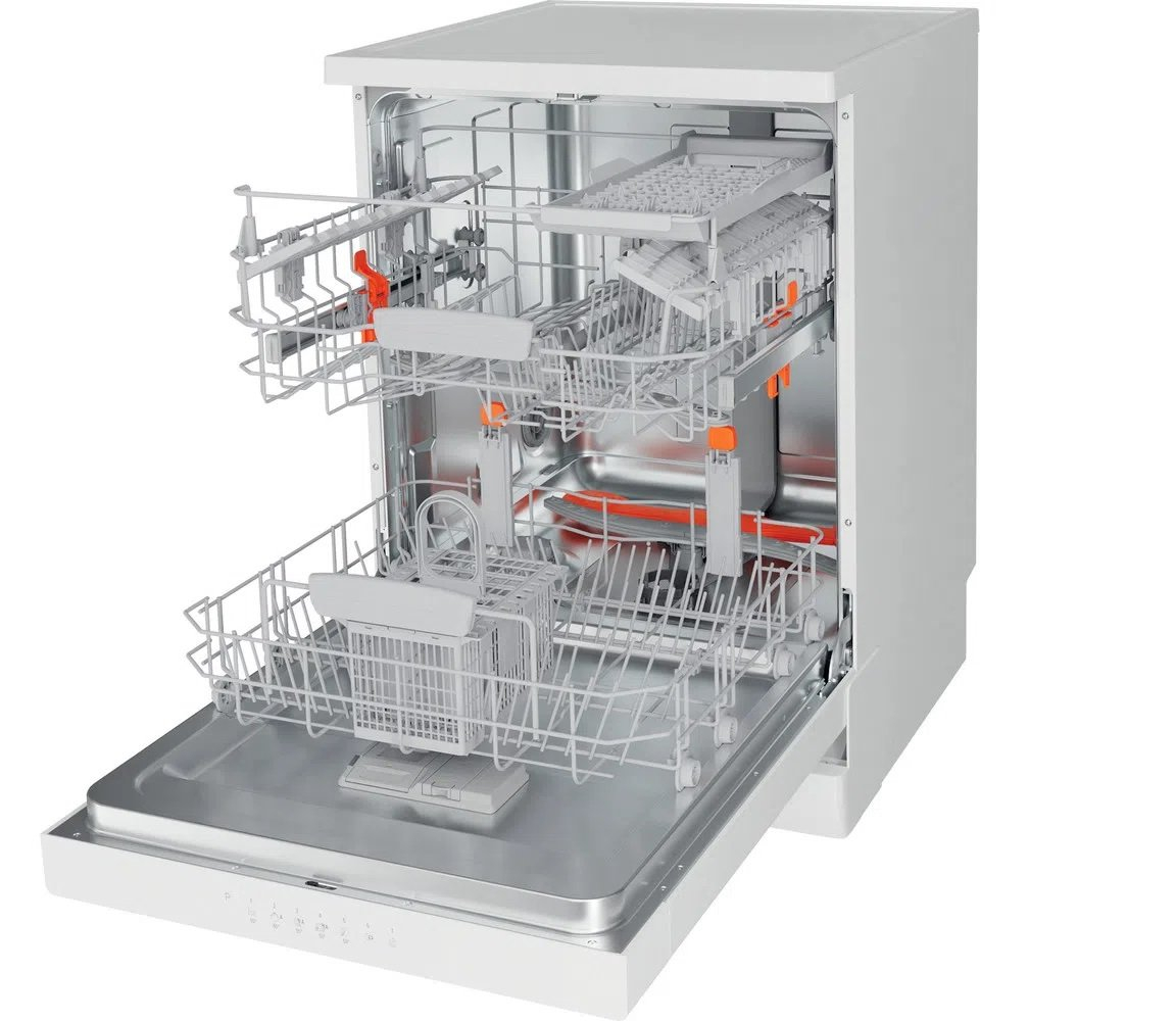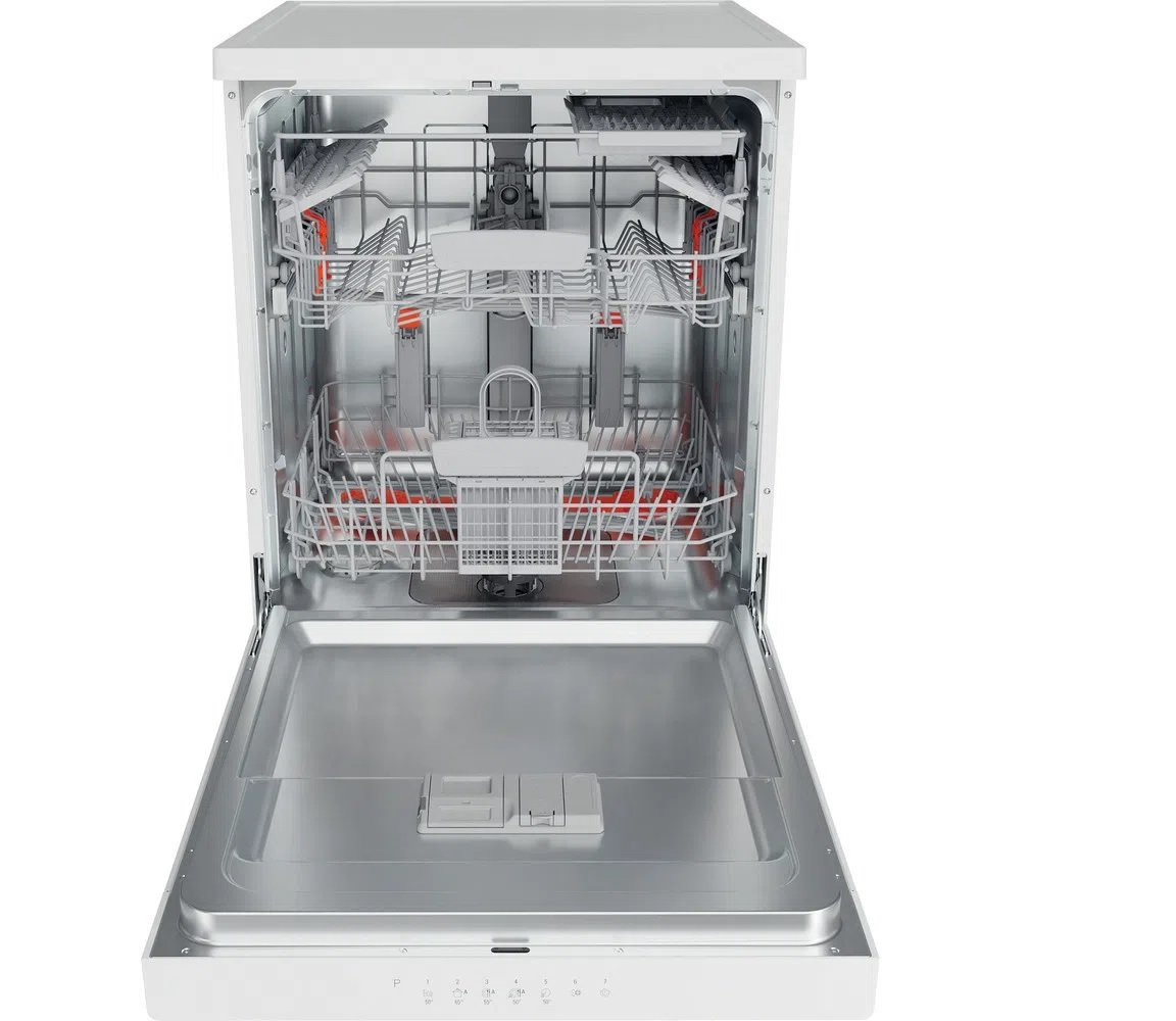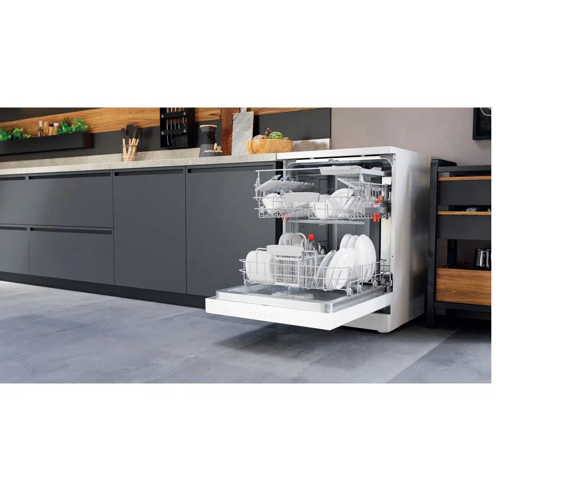 The Hotpoint HFC3C26WCUK 60cm wide dishwasher offers powerful cleaning performance, flexible loading options, and energy-efficient features, all designed to streamline your daily routine. With a 14 place setting capacity, 3D Zone Wash, and an intuitive digital interface, this freestanding model in classic white makes light work of even the toughest loads.