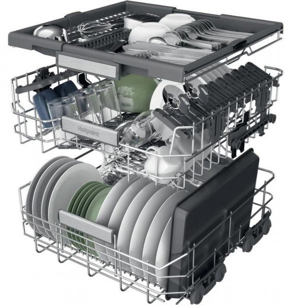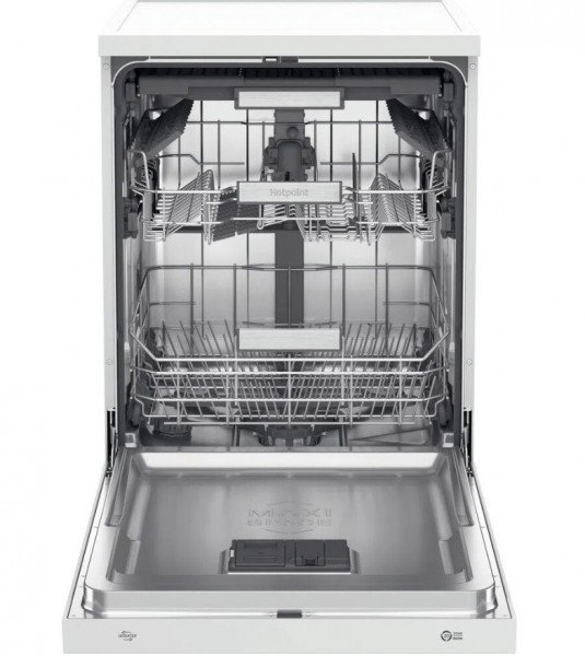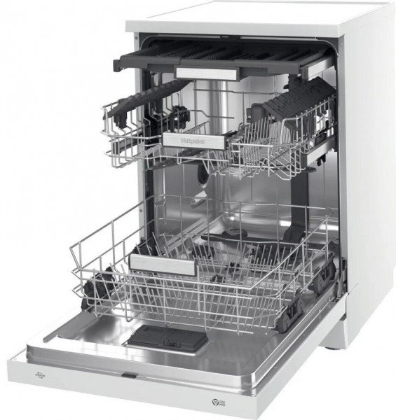 The Hotpoint freestanding H7F HS41 UK dishwasher with itslarge 15 place setting capacity gives you a sparkling clean you can count on, so you can skip the scrubbing. This large capacity model gives you all the space you'll need to clean up after the biggest meals thanks to the Maxi Space tub, which gives you 10%* more usable space in the re designed interior. This model includes 3D Zone Wash to tackle tough, baked on food. A third rack accommodates your utensils and cutlery for a better wash and more space. Sliding and modular, it could be reduced by 2/3 of its surface to arrange bigger dishes or tall glasses in the rack below