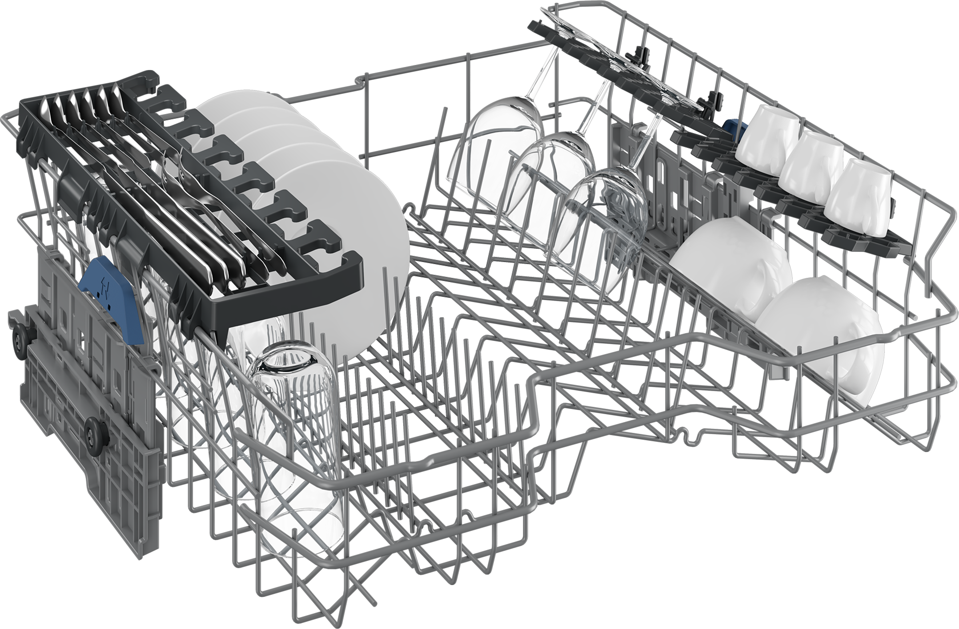 Maximize your dishwasher's capacity with foldable plate supports and an adjustable upper basket that can be set to three different height levels, even when fully loaded. This flexibility ensures you can clean larger dishes, bowls, and saucepans with ease.