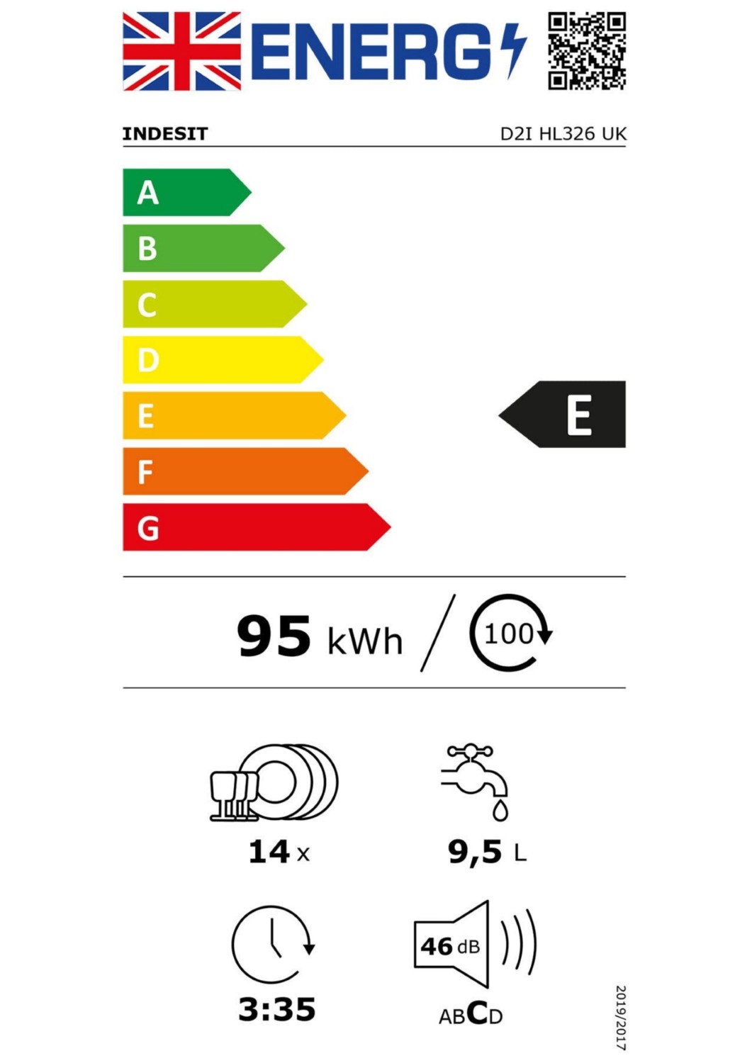 This dishwasher is rated with an energy efficiency class of E, ensuring it uses less power while maintaining high performance. It operates at a noise level of 46 dB, making it a quiet addition to your kitchen. The water consumption is efficient at just 9.5 litres per cycle, helping to conserve water without compromising on cleaning power.