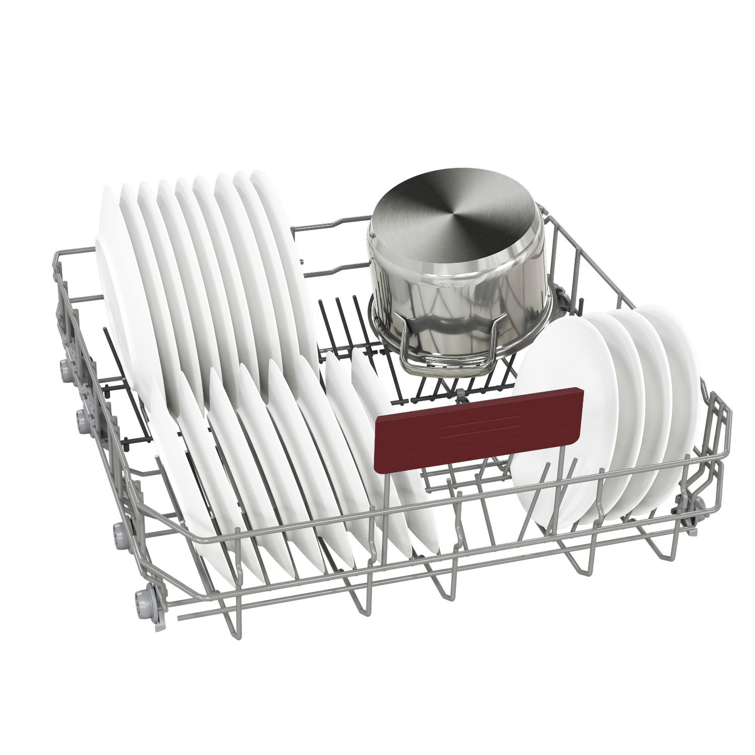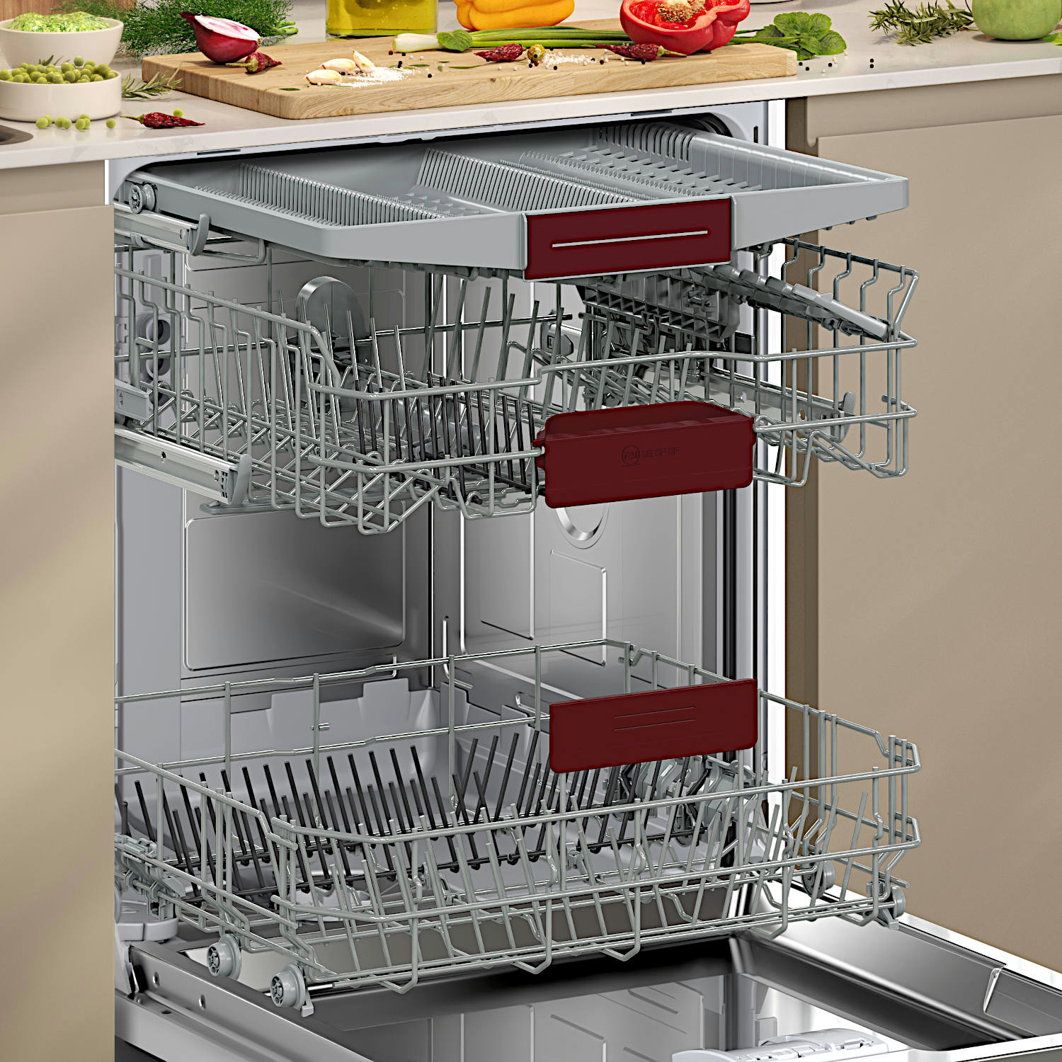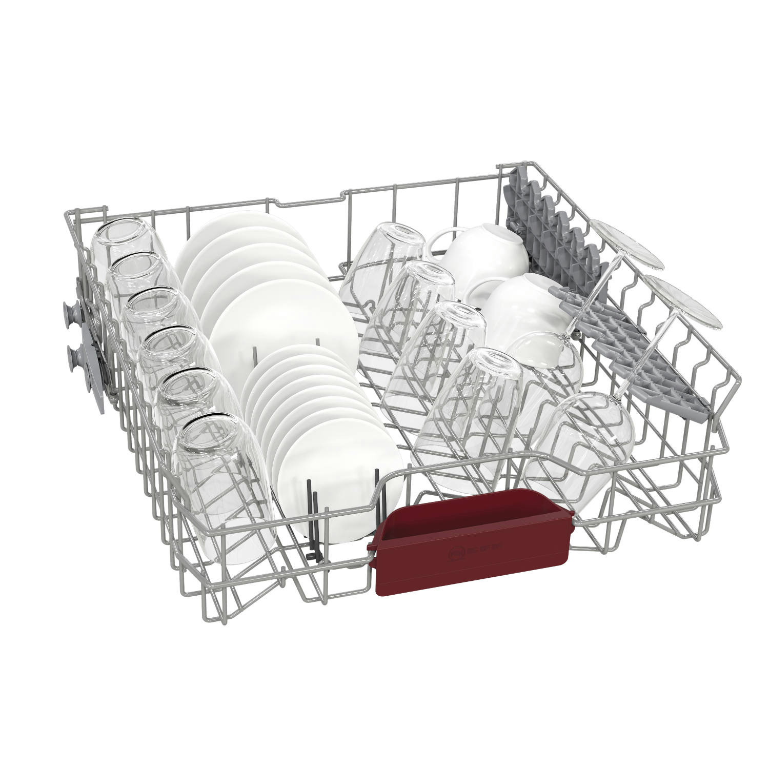 Equipped with Flex 2 baskets, the Neff S155HVX00G dishwasher features six foldable flip tines in both the top and bottom baskets, making it easy to accommodate various dish sizes. The three-stage Rack Matic top basket can be adjusted even when fully loaded, allowing for convenient storage of larger items.
