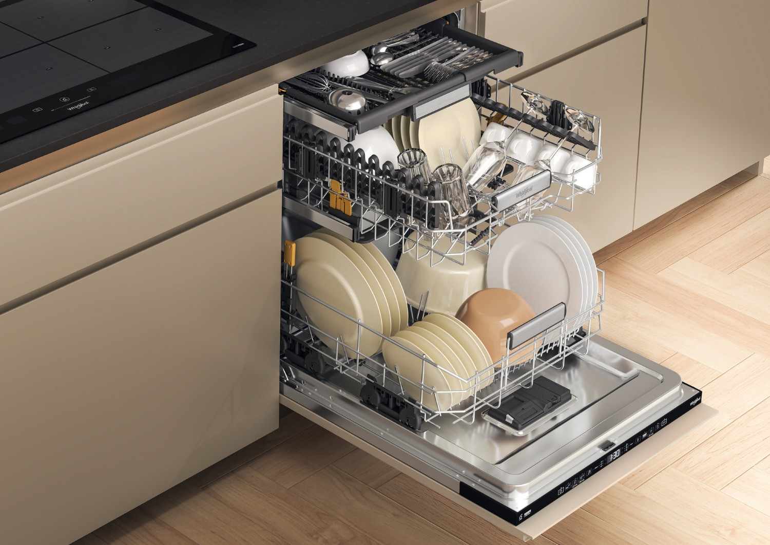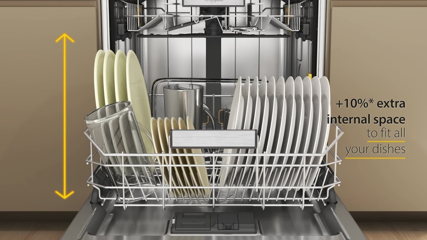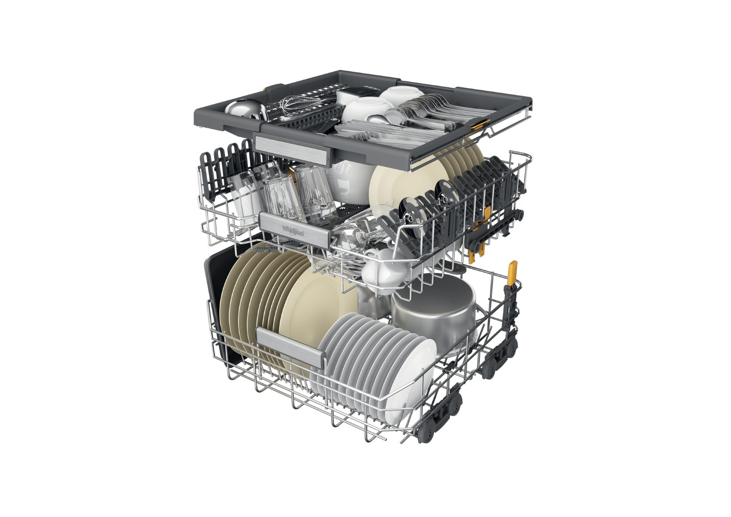 The W7IHT40TSUK is engineered around Whirlpool's innovative MaxiSpace tub, providing 10% more usable space compared to standard dishwashers. This flexibility is enhanced with a flexible third rack and an adjustable upper rack that allows for the accommodation of larger items, ensuring you can fit everything you need, from everyday dishes to bulky casserole trays.