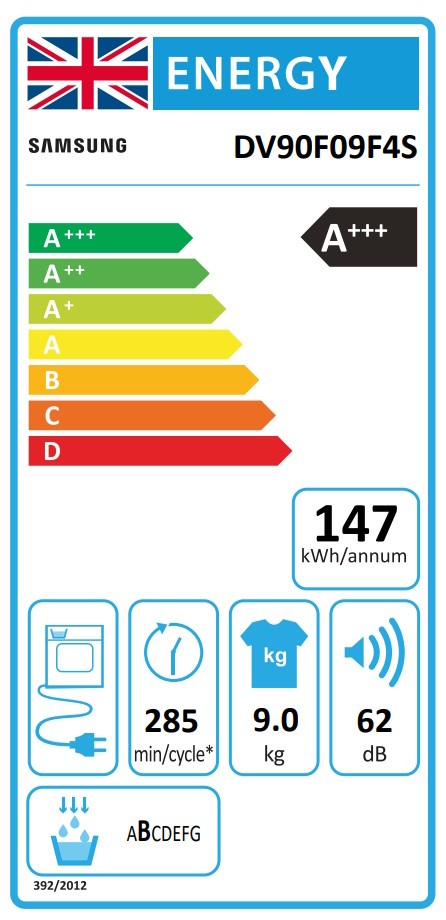 This dryer promises a long lifespan backed by a 5 year parts and labour warranty (after registering with Samsung). Confident in their Digital Inverter Technology (DIT), Samsung have placed a 20 year warranty on the compressor. Samsung's world leading engineering quality ensures excellent performance, all while minimising energy consumption. The DV90F09F4SU1 holds an incredible A+++ energy efficiency rating.
