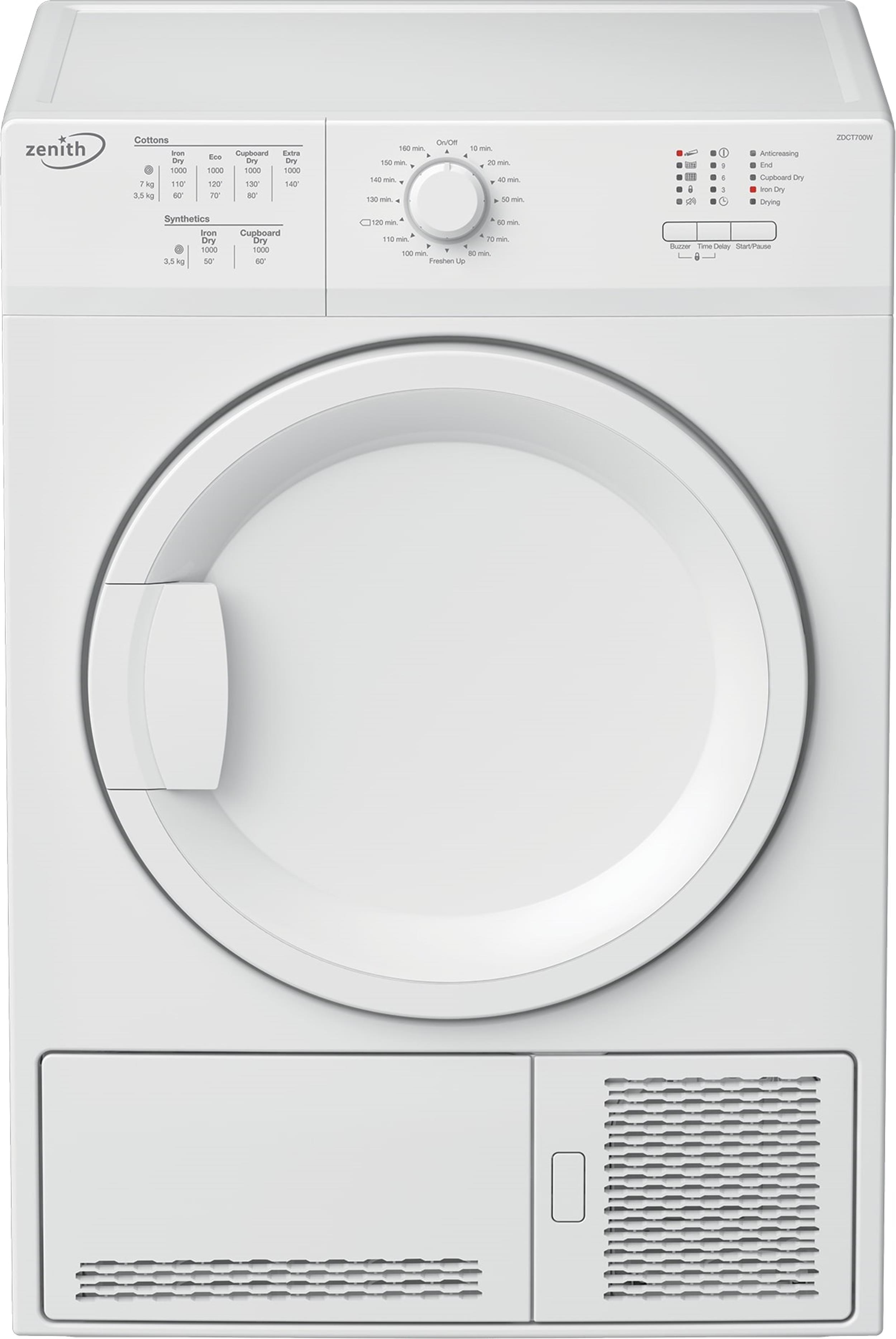 Equipped with 15 timed drying programmes ranging from 10 to 160 minutes, this model offers precise control over each cycle. From quick refresh options to longer drying times for heavier fabrics, the ZDCT700W condenser tumble dryer provides flexibility to accommodate a variety of laundry requirements.