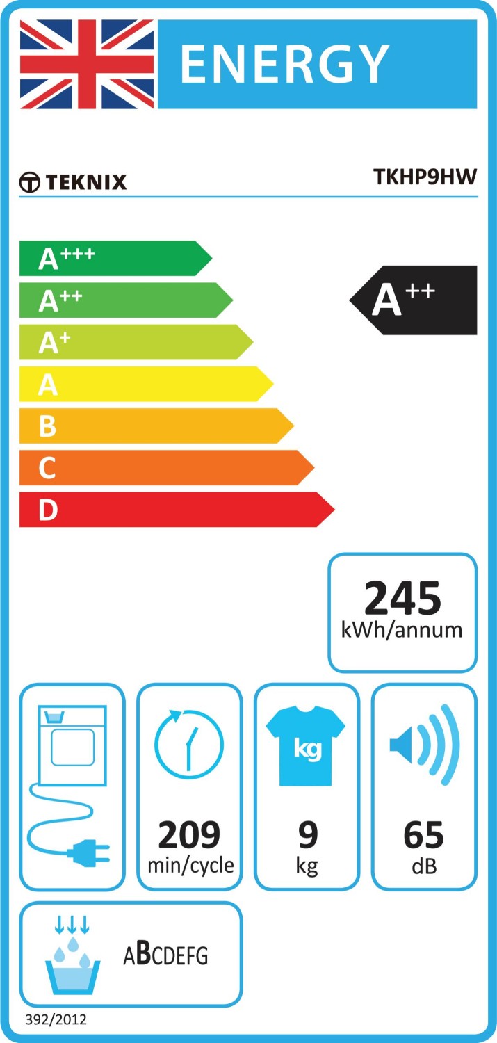The Teknix TKHP9HW boasts an A++ energy efficiency rating, ensuring low energy consumption and cost savings. With a weighted annual energy consumption of 245 kWh, this dryer is an eco-friendly option. The standard cotton program uses only 1.96 kWh for a full load and 1.15 kWh for a partial load, making it an efficient choice for your laundry.