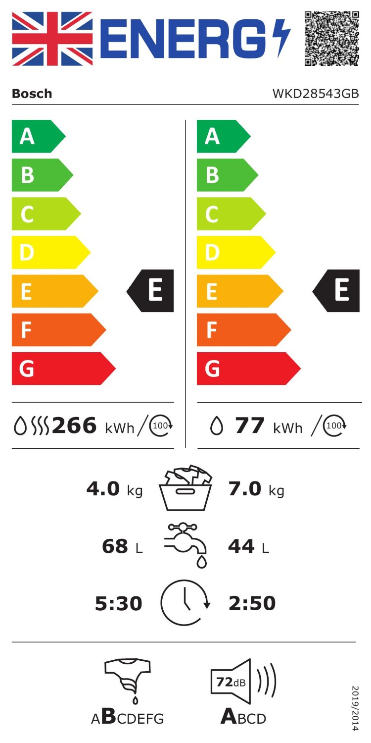 The Bosch Series 6 Washer Dryer is rated with an energy efficiency class of E, highlighting its eco-friendly design. It consumes 77 kWh and 44 liters of water per wash cycle, and 266 kWh and 68 liters for a full wash and dry cycle. These features ensure that you save on utility bills while reducing your environmental footprint. Additionally, the appliance includes programs like Super Quick 15 for efficient, short-duration washes, enhancing its overall energy-saving capabilities.