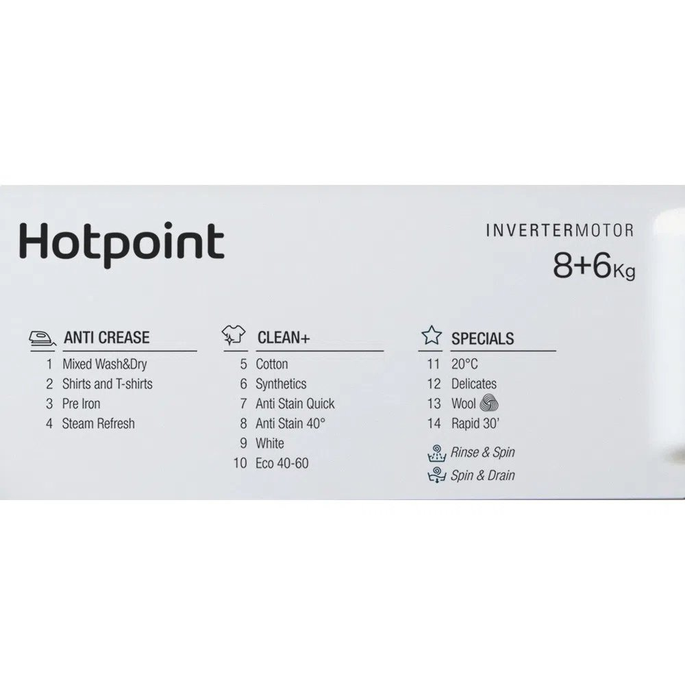 Hotpoint's BIWDHG861485UK offers a variety of wash and dry cycles to suit your daily laundry needs. Choose from options like XS Rapid for small loads, XL Bed & Bath for bedding and towels, and Wash & Dry Mixed for everyday loads. The Wool Care program provides delicate care for woollens, ensuring they remain soft and perfectly clean.