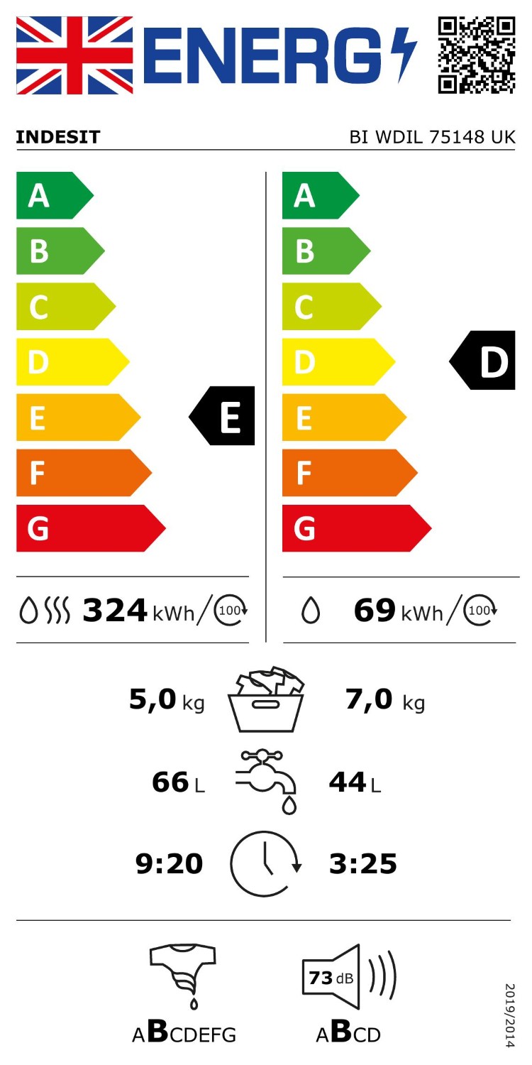 Rated with an energy efficiency class of E and a drying performance class of A, the Indesit BIWDIL75148UK is designed to deliver top-notch performance while minimizing energy consumption. The machine operates at a noise level of 73 dB for washing, spinning, and drying, ensuring a quieter laundry experience.