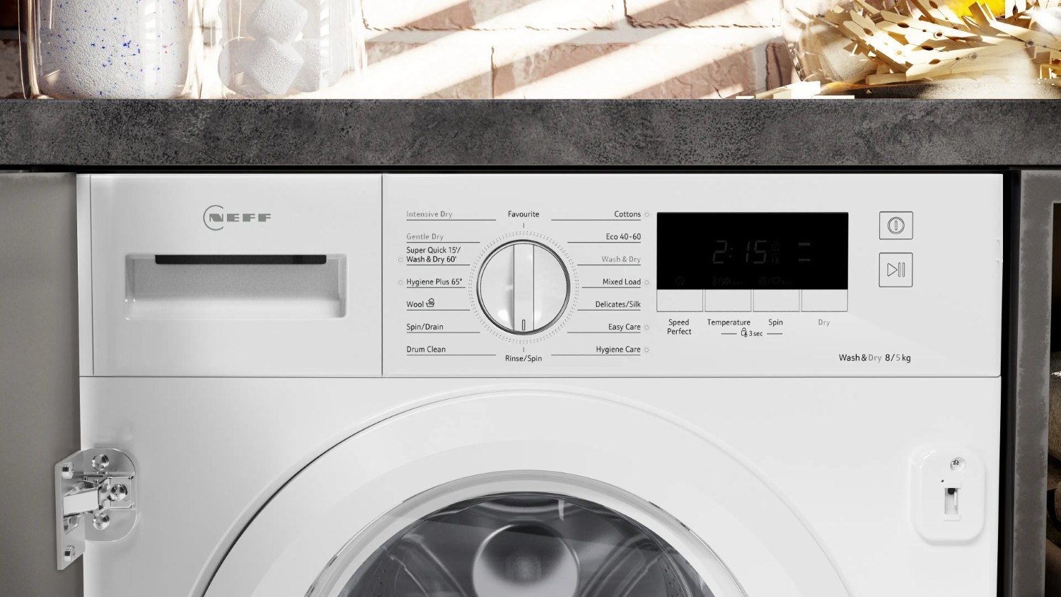 Neff's V8340X0GB integrated washer dryer delivers convenience without compromising on care. It combines an 8kg wash capacity and 5kg drying capacity with multiple specialised programs, and practical options like SpeedPerfect for fast results.