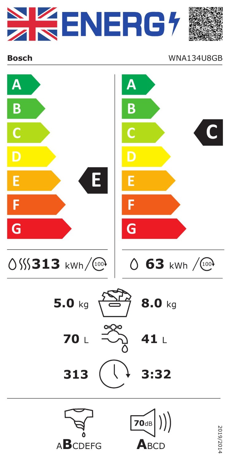Energy / Water Wash and Dry: 313 kWh / 70 litres.