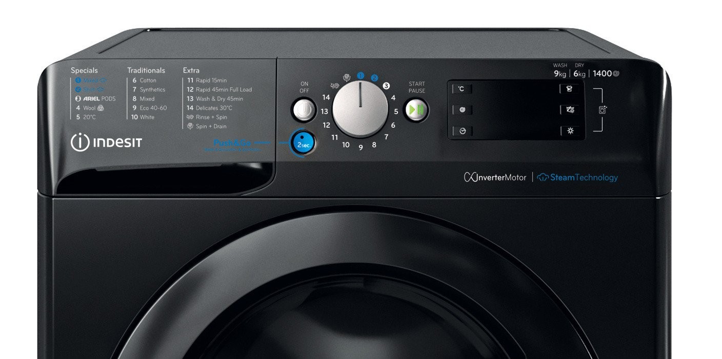Indesit's BDE96436KVUK washer dryer combines efficient washing and drying capabilities in one freestanding appliance. Advanced features like Push&Go technology and quick wash options simplify laundry care, ideal for busy households looking to save time without compromising on cleanliness.