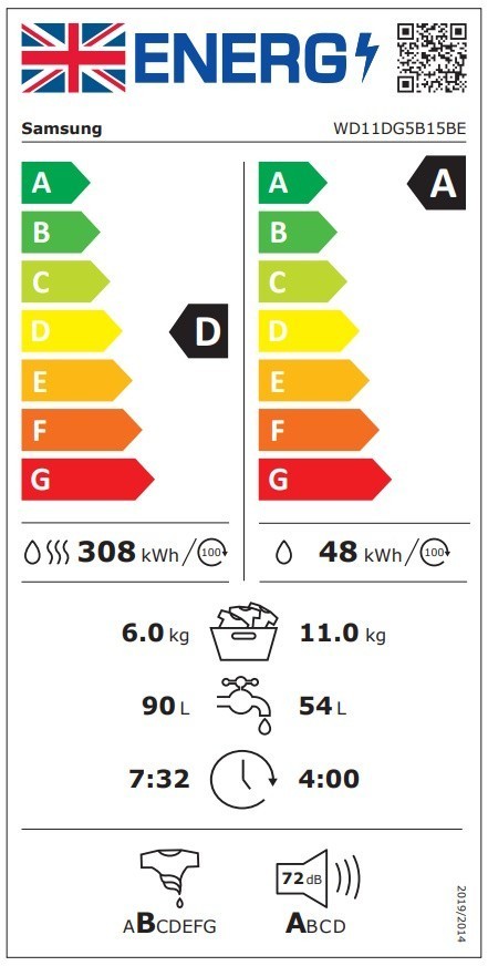 Samsung's WD11DG5B15BEEU washer dryer combines incredibly innovative washing and drying capabilities in a classic white finish. With a very generous 11kg washing capacity and 6kg drying capacity, this washer dryer combines hygienic competency, capability, and extreme energy efficiency.