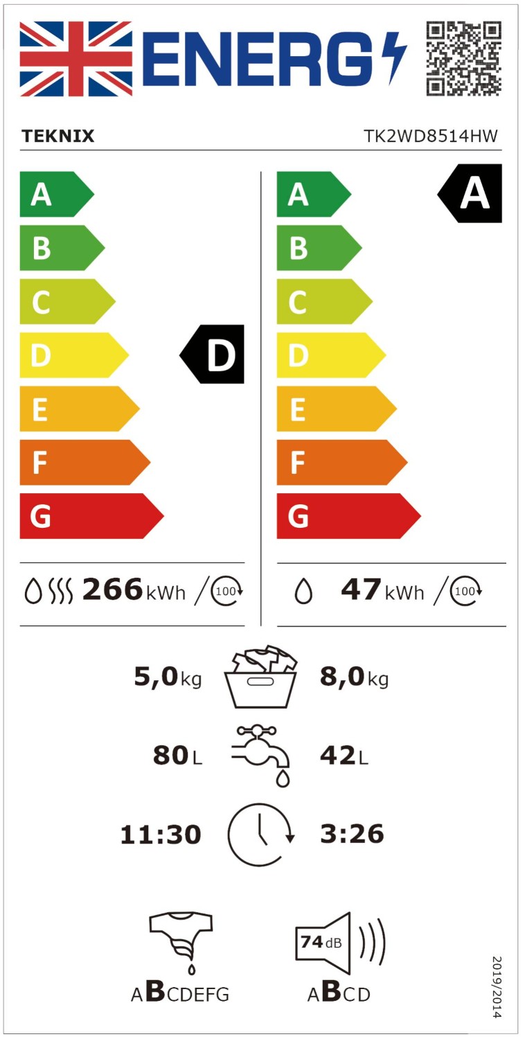 Teknix's TK2WD8514HW washer dryer is a versatile and efficient appliance designed to meet your laundry needs with ease. With an 8kg washing capacity, 5kg drying capacity, and a 1400 spin speed, this washer dryer offers a range of programs and features to ensure your clothes are cleaned and dried effectively. Its energy efficient design and user friendly interface make it a great addition to any home.